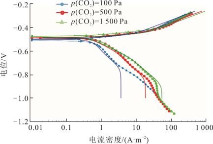 图2 API 5L X65低碳钢在10 ℃、0.1 mol/L NaCl溶液、 4.6 m/s流速、pH=6以及p(CO2)=100、500、1500 Pa条件下的极化曲线(实线为模型预测曲线)