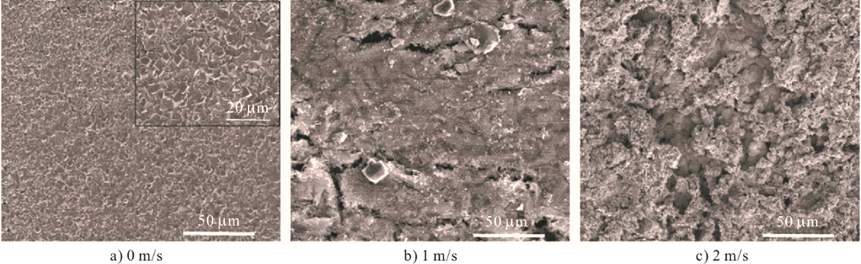 李岩岩等发现,在超临界CO2环境中,流体流动加速了腐蚀性物质向钢材表面传质过程,同时对钢材表面施加了剪切应力,破坏了FeCO3膜的完整性和致密性(图4),从而加快了腐蚀速率。除此之外,流速变化还可能造成钢材的局部腐蚀。