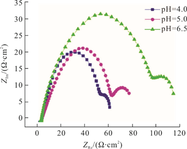 Deng等采用电化学方法研究了不同pH值对X80钢冲蚀行为的影响,发现随着pH值的增加,X80钢的自腐蚀电位负移,腐蚀电流密度呈逐渐减小的趋势,阻抗谱图的电容和电阻弧半径逐渐增大,总极化电阻增大,腐蚀速率降低,耐蚀性提高(图5)。