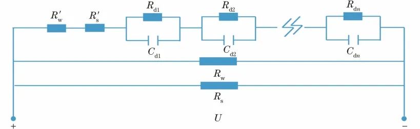 由于ARCHIE和WAXMAN模型均未考虑第三种土壤导电途径,存在一定的理论局限性和不合理性。MITCHELL三元导电理论的等效电路模型如图3所示,其中,RW表示孔隙水液相导电路径电阻,RS表示固体颗粒导电路径电阻,R′W为第二种导电途径上液相总电阻,R′S为第二种导电途径上固相总电阻,Rd1~Rdn是土壤结构不均匀性导致的n层电介质等效电阻,Cd1~Cdn是n层电介质等效电容。