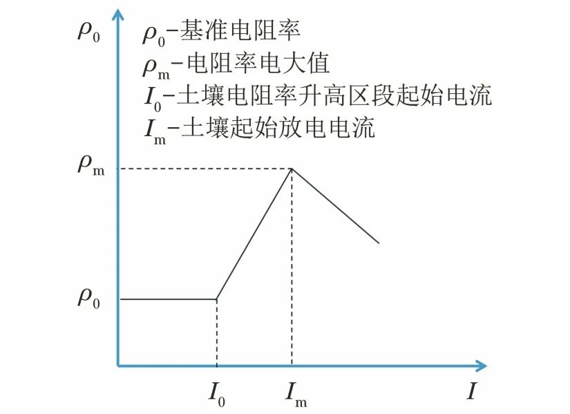 对于电弧区,其电阻率可设定为金属导体的电阻率;对于火花放电区,依据对大量冲击特性试验数据的分析结果,可取7%ρ0;对于半导体区,土壤电阻率为区域内电场强度的函数,即ρ=f(E);恒定电导区,电阻率为基准电阻率ρ0,保持不变。