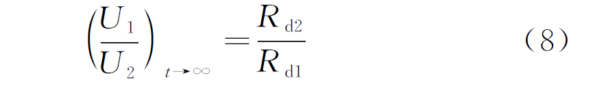 当t→∞时,即电路完全稳定时,电容支路相当于开路,此时两层电介质上的电压与电阻成反比,见式(8):