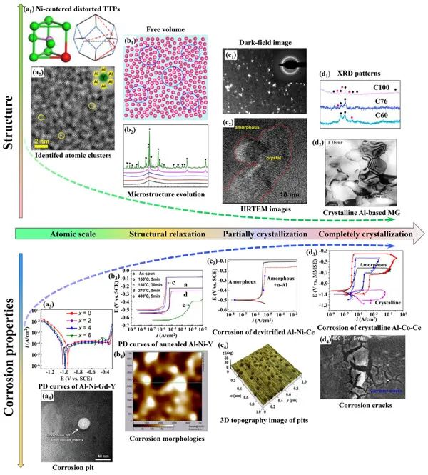 从组元特性视角,针对点蚀过程的不同阶段,剖析了合金元素对铝基非晶合金耐蚀行为的作用机制(图1)。