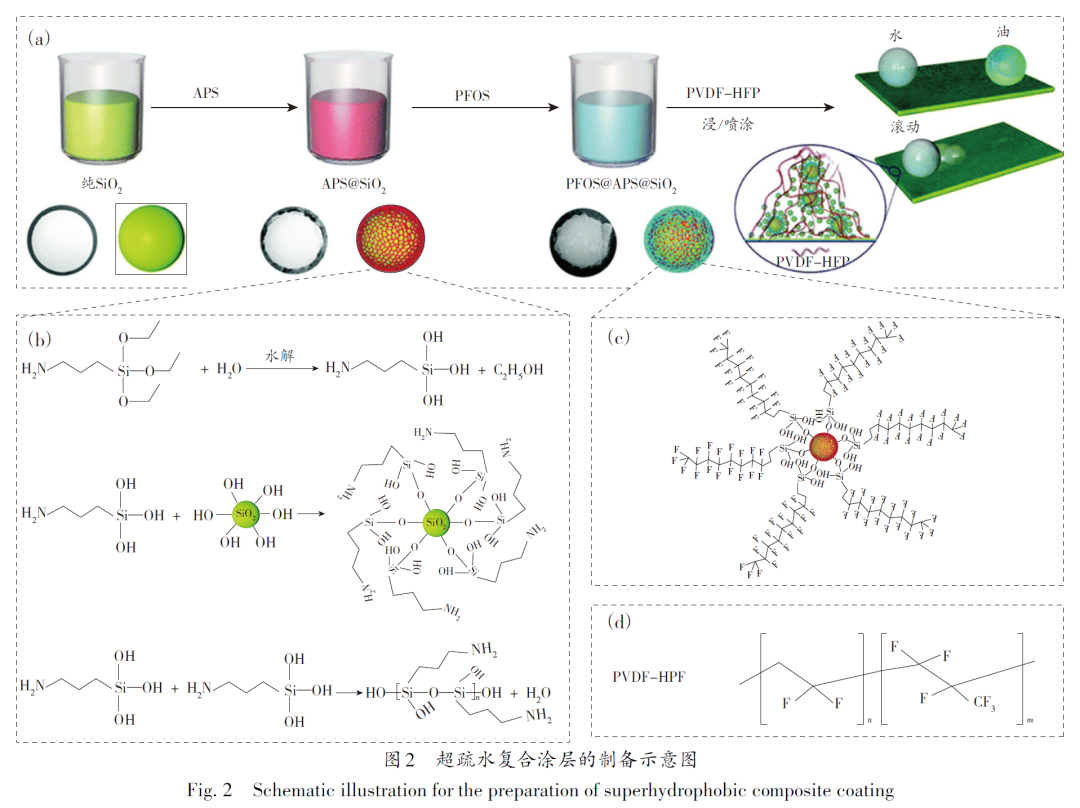 喷涂法是指将聚合物和纳米颗粒的混合溶液在一定压力下从喷枪中喷出,形成雾状黏附在基底表面的方法。该方法工艺简单,成本低廉,适用于多种基材,且易于实现大规模的生产。但喷涂法通常要求溶液有较低的黏度,这样就需要用到较多的有机溶剂,溶剂挥发会造成资源浪费且污染环境。Li等采用3-氨丙基三乙氧基硅烷(APS)和1H,1H,2H,2H-全氟癸基三乙氧基硅烷(PFOS)修饰SiO2,再将其与聚偏氟乙烯-六氟丙烯共聚物(PVDF-HFP)混合喷涂在不同基底上,制得超疏水复合涂层,制备过程如图2所示。该涂层兼具超疏水性和超疏油性,且具有良好的耐酸碱、耐高温和自清洁等性能。Zhao等将由全氟癸基三甲氧基硅烷修饰的纳米及微米SiO2、聚二甲基硅氧烷(PDMS)以及聚偏氟乙烯(PVDF)均匀分散或溶解在乙酸乙酯/二甲基甲酰胺混合溶剂中,然后利用喷涂法将其涂覆在铝合金表面,固化后得到水接触角达到162.6°的超疏水涂层,具有优良的防腐和减阻性能,在轮船涂装领域的应用前景广阔。