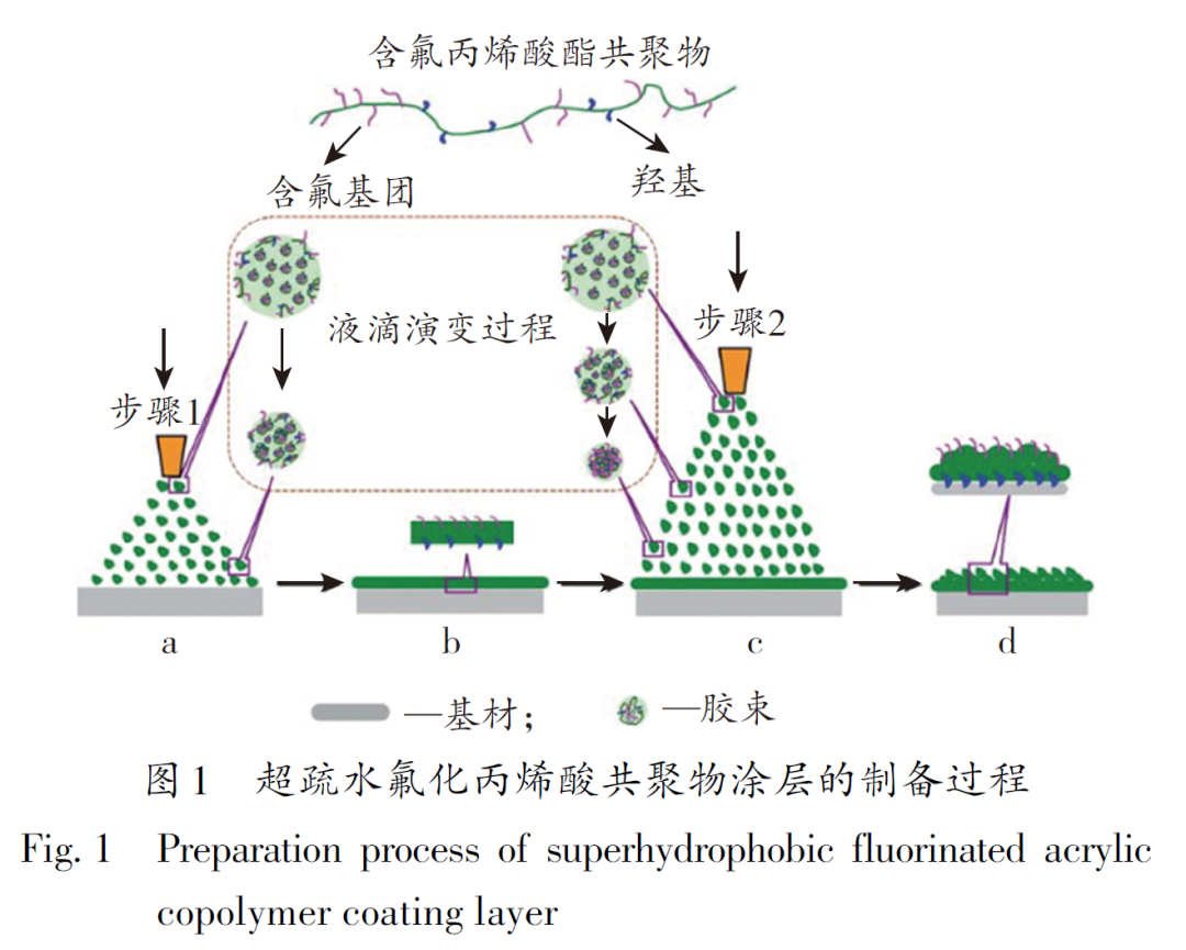 相分离法是将聚合物溶液中的液相移除,使聚合物成膜并得到多孔、粗糙结构的方法。此法有利于获得超疏水介孔薄膜,但对溶剂、温度等制备条件较敏感。Li等首先通过溶液聚合合成了含氟聚丙烯酸酯共聚物,然后利用含氟链段在不同溶剂中的溶解度差异产生相分离,制备了含氟聚丙烯酸酯超疏水涂层,如图1所示。在制备过程中,通过改变溶剂醋酸乙酯和甲基异丁基甲酮的用量,可以获得不同形貌的超疏水涂层。