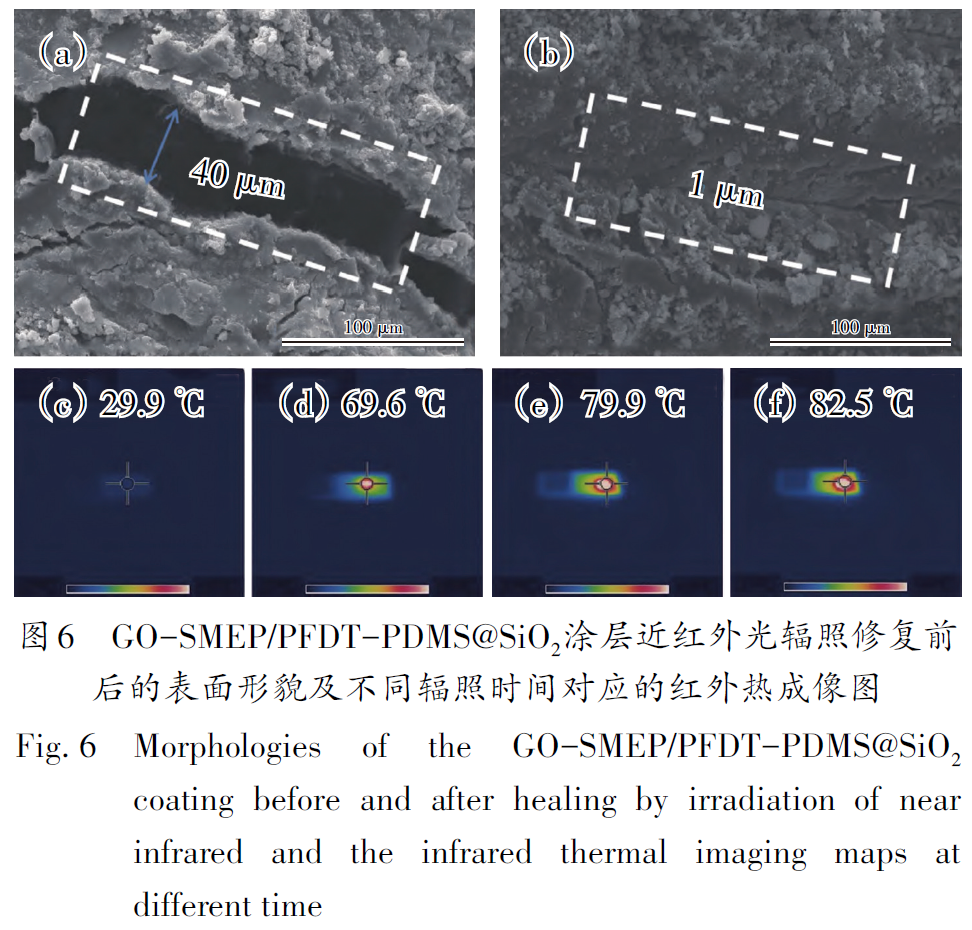 超疏水涂层在使用过程中,其表面的微纳米粗糙结构极易受到外力刮擦而被破坏,同时修饰的低表面能物质也会在日照或者强酸强碱的恶劣环境中被分解,从而导致超疏水性的丧失。将自修复性与超疏水性结合起来制备自修复超疏水涂层,可以使其表面的超疏水性丧失后自发地或者在一定条件下恢复。朱航等以含有丰富氢键的超支化聚合物(HB-PDMS)作为黏性自修复聚合物,通过十四酸对纳米SiO2进行疏水改性作为疏水粒子以构筑表面粗糙结构,制备了自修复超疏水涂层。该涂层的水接触角和滚动角分别为152.61°和1.9°。用刀片划伤涂层后,经过简单热处理即可修复划痕,自修复性能优异。此外,该涂层还表现出良好的防腐性能,缓蚀效率达87.53%。赵亚梅等以具有光热效应的自修复涂层氧化石墨烯-形状记忆环氧树脂(GO-SMEP)为底层,以多级粗糙微纳米结构的超疏水涂层全氟癸基三甲氧基硅烷-聚二甲基硅氧烷@二氧化硅(PFDT-PDMS@SiO2)为表层,基于双层设计获得了一种快速修复物理损伤的光热自修复超疏水涂层GOSMEP/PFDT-PDMS@SiO2。经过808 nm 近红外光照射3 min,其表面温度可从29.9 ℃升至82.5 ℃,物理划痕可从40 μm修复至约1 μm(图6)。