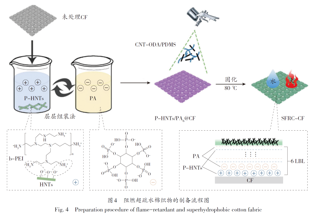 等通过层层组装法和喷涂法制备了一种兼有超疏水性、阻燃性和导电性的多功能棉织物。首先将支化聚乙烯亚胺(b-PEI)处理后的埃洛石纳米管(P-HNTs)和植酸(PA)交替覆盖于棉织物(CF)上,接着喷涂十八胺改性羧基化碳纳米管(CNTODA)/聚二甲基硅氧烷(PDMS)杂化涂层,固化后得到水接触角达162°的功能性棉织物(图4)。由于b-PEI和PA之间的N-P协同作用和埃洛石纳米管的物理阻隔作用,棉织物表现出优异的阻燃性能,其垂直燃烧试验的炭化长度仅为5.4 cm。Lin等将棉织物浸泡在包含正硅酸乙酯、羟基封端的PDMS和聚磷酸铵的乙醇溶液中,通过原位溶胶凝胶法在织物表面生成了阻燃超疏水涂层,其水接触角达到160°,织物在垂直燃烧试验中的炭化长度为8 cm。该方法具有操作简单、效率高等优点,适宜大规模制备和实际应用。目前,无机纳米阻燃剂和绿色天然阻燃剂是该领域的研究热点。