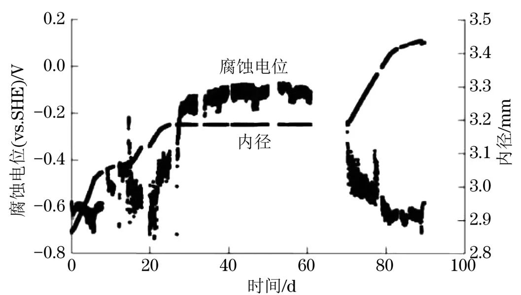 截至2020年8月,全球可运行核电机组共441台。核电厂二回路系统是发电系统的核心部分,碳钢、不锈钢、耐蚀镍合金、铜镍合金、钛合金等是二回路常用的金属材料。二回路给水管线、凝结水管线、疏水管线等不可避免地会发生流动加速腐蚀(FAC)。 统计数据表明,FAC引起的管道失效量占管道失效总量的33%,在所有管道失效因素中位列第一名。为预防和减少FAC导致的事故,技术人员从1970年前后就开始对FAC进行了研究。这些研究主要集中在FAC的机理、影响因素、预防及缓解措施等三个方面。 FAC的机理与影响因素 碳钢、不锈钢以及Cr合金等材料表面的氧化膜能够有效降低材料基体直接与外界接触造成的腐蚀。但表面的氧化膜与溶液接触会发生溶解,若溶液是流动的,还会加速溶解过程,该现象称为FAC。 氧化膜溶解会导致金属基体暴露发生腐蚀,从而使材料厚度减薄,产生安全隐患。FAC现象在核电、石油和天然气行业都较为常见。 FAC过程是基体-氧化膜界面和氧化膜-溶液界面的微观溶解(传质)过程。以碳钢为例,FAC的机理如图1所示,在基体-氧化膜界面处,基体中的铁通过氧化反应转变为Fe3O4、Fe(OH)2;在氧化膜-溶液界面处,主要发生氧化膜溶解产生可溶性Fe2+这一过程,Fe2+通过流体边界层向主流区域扩散。因此,FAC的整个过程可以视为金属氧化膜和基体的溶解引起了金属的减薄。 图1 碳钢FAC机理示意 FAC的发生可以看作是两个相互影响过程,即化学溶解和传质过程。当这两个过程的影响因素发生变化时,FAC会随之产生偏移。这些影响因素可归结为流体动力学因素、化学环境因素、材料因素。 流体动力学因素 流体在管道中的流动状态受流体流速、管路几何形状、流体各相比等影响。二回路系统中的主要介质为化学处理过的碱性水,在不同管段以过热干蒸汽、湿蒸汽、饱和液等形态存在。流动状态与流体形态都会影响FAC的传质过程。 流速 流动边界层是金属氧化膜溶解产生的铁离子向主流区域扩散的通道,其扩散速率(传质速率)与边界层厚度成反比,流速越大,边界层厚度越小,则传质速率越快。 伊成龙测定了内径为2.0、2.2、2.4 mm的P11钢管在温度273 ℃下的FAC速率,结果发现内径为2.0 mm的钢管减薄最严重。 UTANOHARA等研究发现,90°弯头的FAC速率随着流速增加而增加,当流速为0.39~5.74 m/s时,对应的FAC速率为0.1~0.35 mm/a,流速与FAC速率之间的关系是非线性的。 SUBRAMANIAN等和YONEDA等的研究得到了相似的结论,即FAC的速率与流速的1.0~1.5次幂成正比。 SATOH等通过数据拟合得到FAC速率与流速的1.7次幂成正比的结论。试验条件不同是导致幂指数存在差异的原因。 管道几何形状 当流道(孔板、变径、弯头、三通等)的几何形状发生突变时,会产生涡流、回流等现象,内部的传质过程发生变化。 AHMED分析了弯头、孔板等部件上下游流场及FAC速率的变化,发现流体流经管道部件会产生邻近效应,导致下游临近管线FAC减薄率上升近70%;同时明确了受临近效应影响的下游管线长度约为管道直径的5倍。 马娜等将某核电厂由于减薄而更换下来的弯头进行了X射线衍射分析,结合弯头先前的工作参数,发现弯头曲率过小是导致其减薄的主要原因。 SINGH等通过试验研究发现流体流经管道连接焊缝时,会在焊缝下游产生涡流,导致焊缝处材料FAC加重。 流体各相比 二回路中的流体主要涉及气液两相流。FERNG等使用台湾核电站低压汽轮机进行了气液两相流FAC试验,并指出气液两相流系统中的腐蚀主要由液滴撞击氧化膜产生,重力、离心力、两相分离等是影响腐蚀的关键因素。 AHMED等研究发现,在雷诺数相同情况下,当入口流体中气相质量分数由0.001%增加至0.003%时,孔板下游管段的FAC速率峰值下降约34.2%。 李鹏通过计算流体力学(CFD)软件模拟得到流速为0.58 m/s条件下,入口流体含气率在0.1%~1.0%范围逐渐增加时,弯头FAC速率从0.37 mm/a逐渐减小至0.13 mm/a。 环境因素 环境因素是影响FAC的众多因素中不可忽视的因素,包括流体温度、pH、溶解氧含量等。 温度 REMY等认为温度对FAC产生的影响是间接的,且具体表现在两个方面。一方面,随着温度的升高,溶液中亚铁离子含量降低;另一方面,温度对流体黏度和控制传质过程的亚铁离子扩散速率的影响非常大。 对于单相流,最大腐蚀速率出现在温度为130~150 ℃时;对于两相流,最大腐蚀速率则出现在100~250 ℃时。在温度为125、180、225 ℃时,碳钢表面氧化膜的厚度稳定在1 μm左右,125 ℃时氧化膜比较疏松,180、225 ℃时氧化膜变得比较致密,在温度超过130 ℃时,碳钢表面氧化膜的孔隙率随温度升高而变小。 pH Fe3O4的溶解与FAC速率有直接关系,当pH<9.8时,Fe3O4的溶解度随温度升高而增大,当pH为9.8~10.3时,Fe3O4的溶解度随着温度升高而降低。这是因为温度影响了Fe(OH)2与Fe3O4转换的反应平衡常数。 王柱等研究发现,在气液两相条件下,当某电厂二回路的给水pH由9.0提高至9.6,给水中铁离子质量分数由2.2 μg/kg降至1.0 μg/kg时,管壁减薄速率下降约100倍。 溶解氧含量 JIANG等发现对蒸汽发电回路进行微氧处理后,管道内亚铁离子质量分数下降约80%。这是由于加氧处理后,氧化膜表面的FeOOH和Fe2O3更易转化为Fe3O4。 WOOLSEY等分别在115 ℃、pH 9.1和150 ℃、pH 7.8条件下对碳钢进行了腐蚀减薄试验。结果发现:当二回路中氧气质量分数为2.1~3.0 μg/kg时,碳钢的减薄速率保持在0.99 mm/a,氧气质量分数达到3.8 μg/kg后,减