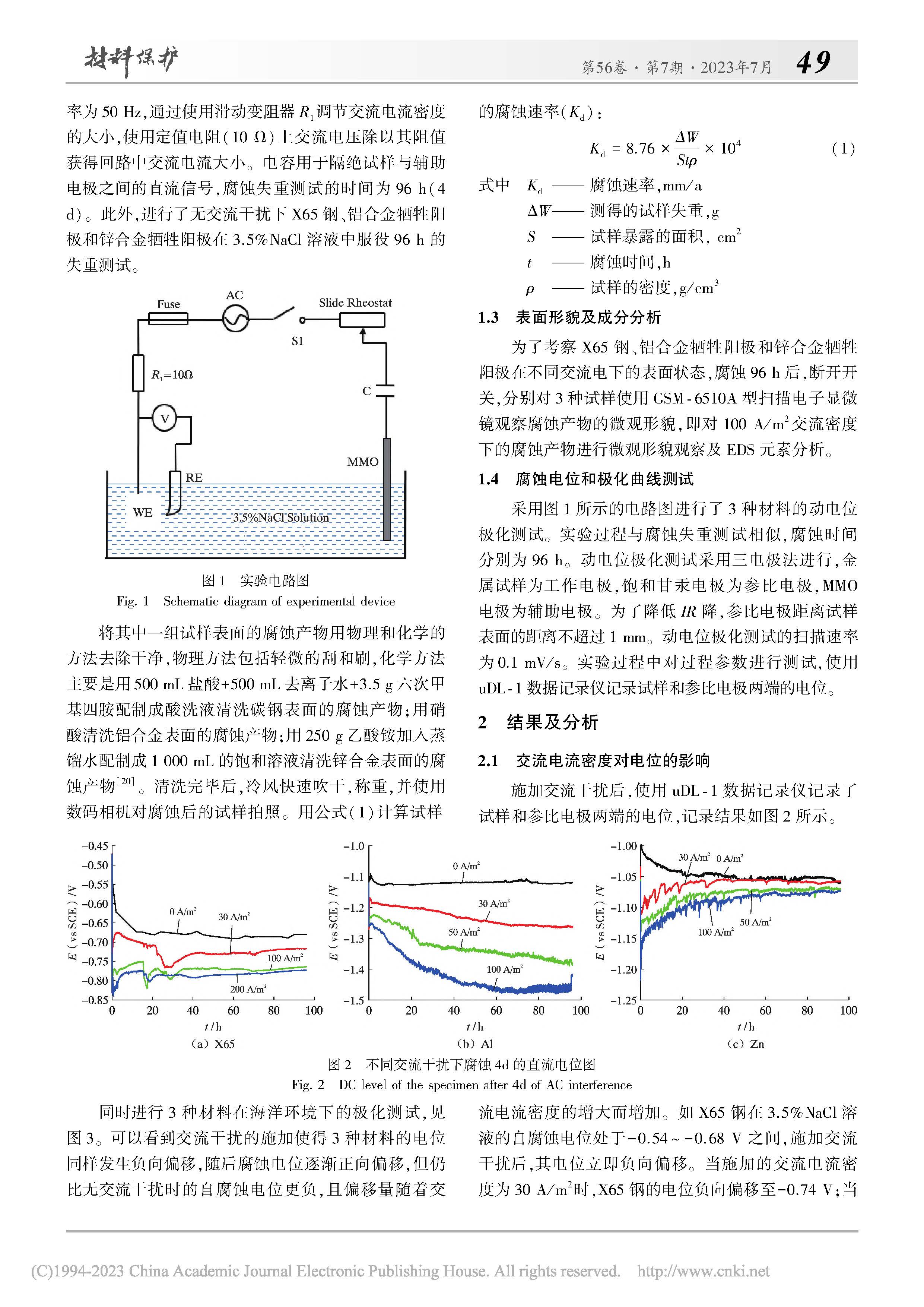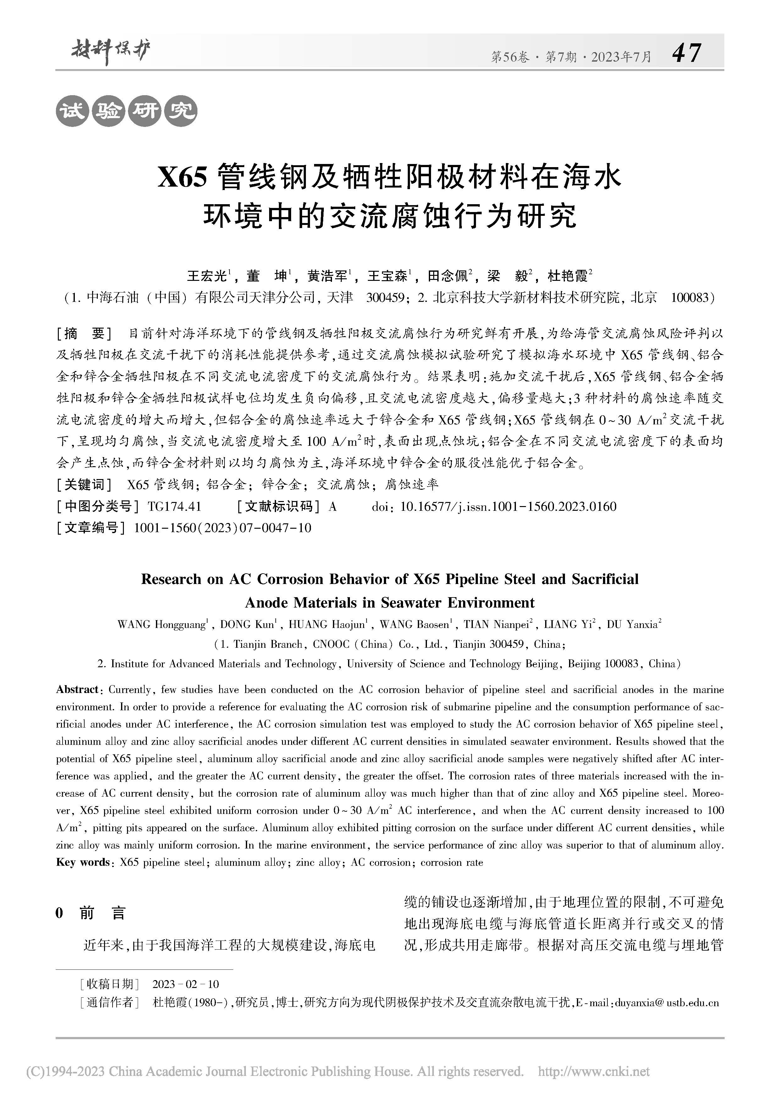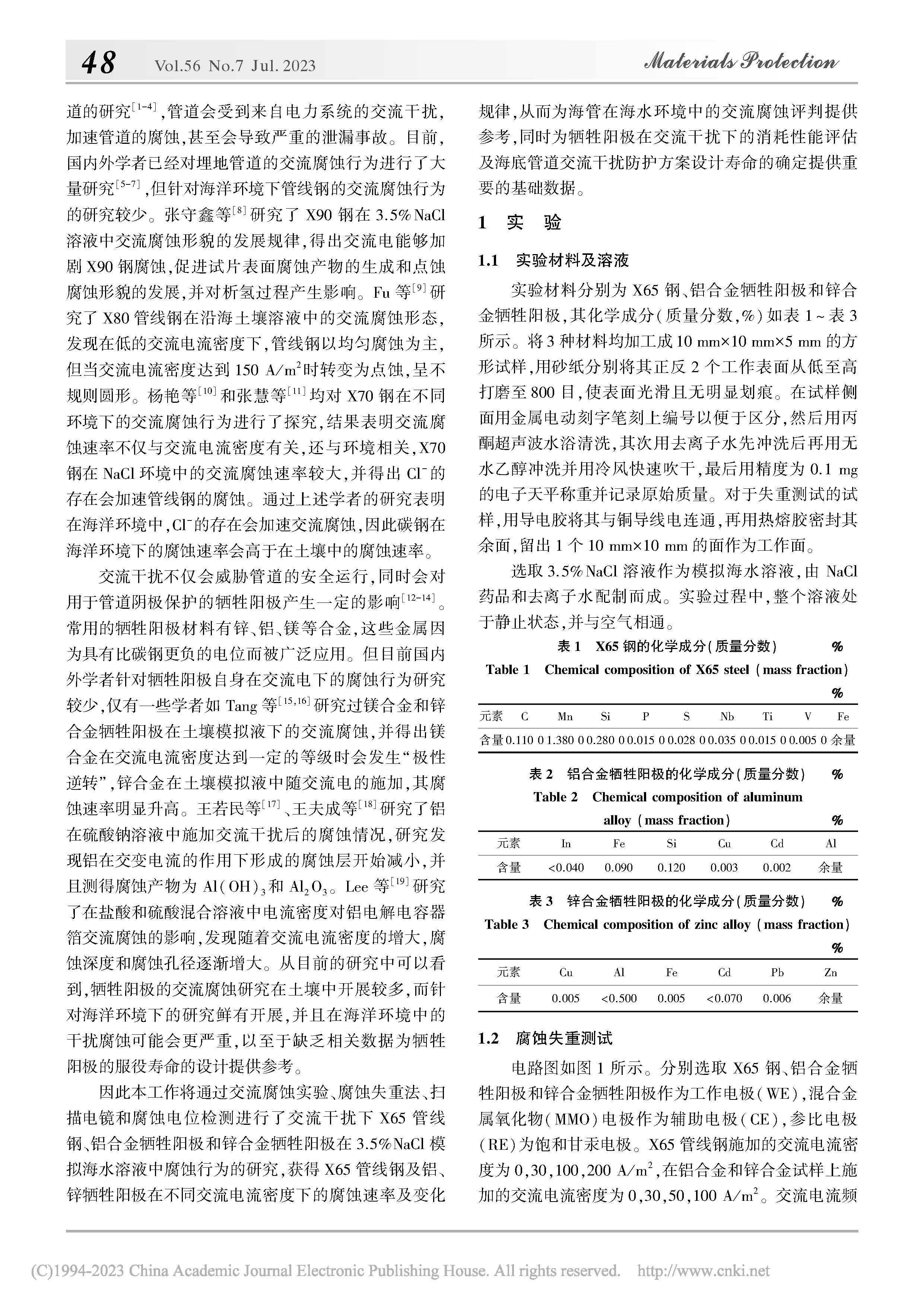 X65 管线钢及牺牲阳极材料在海水环境中的交流腐蚀行为研究