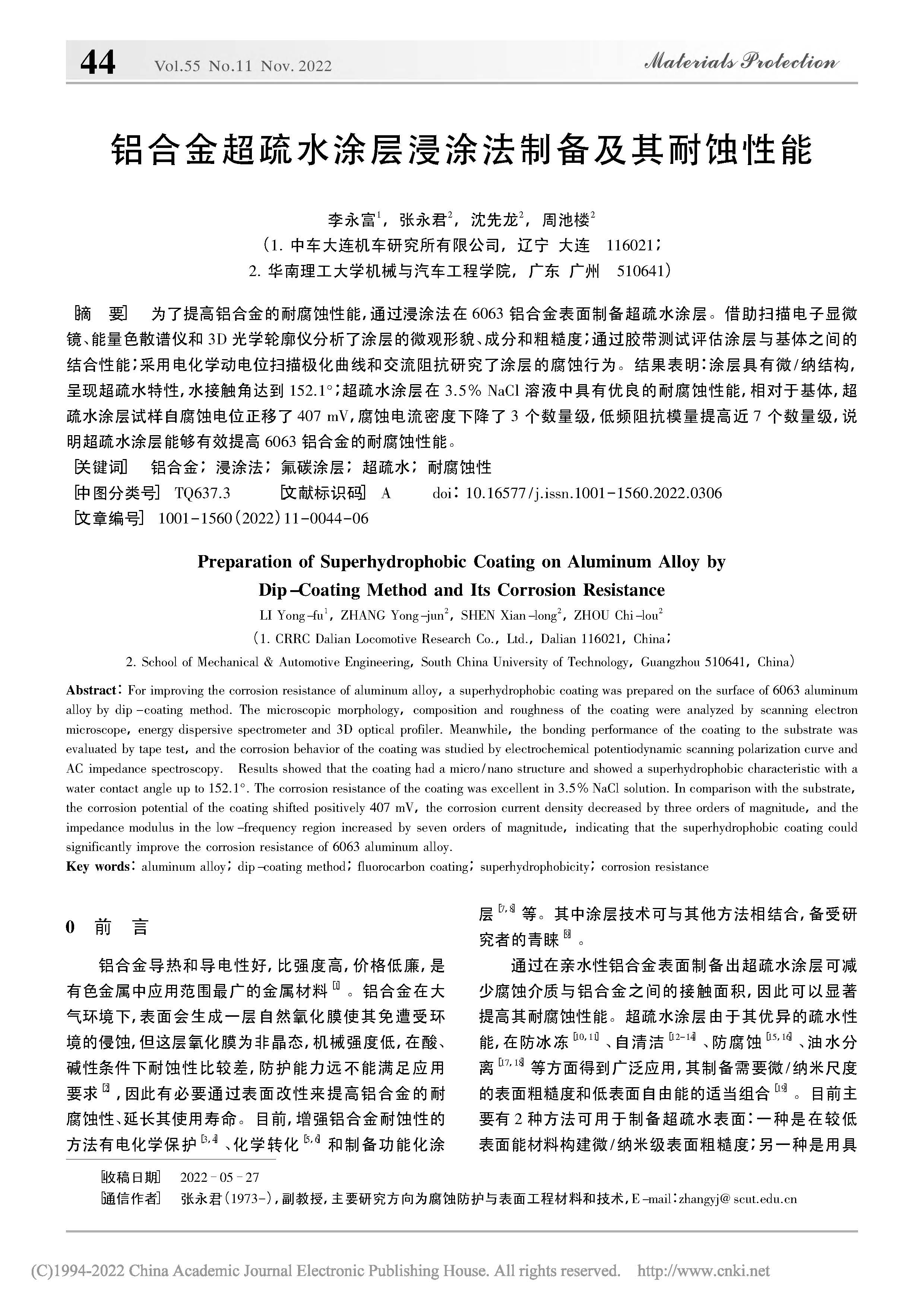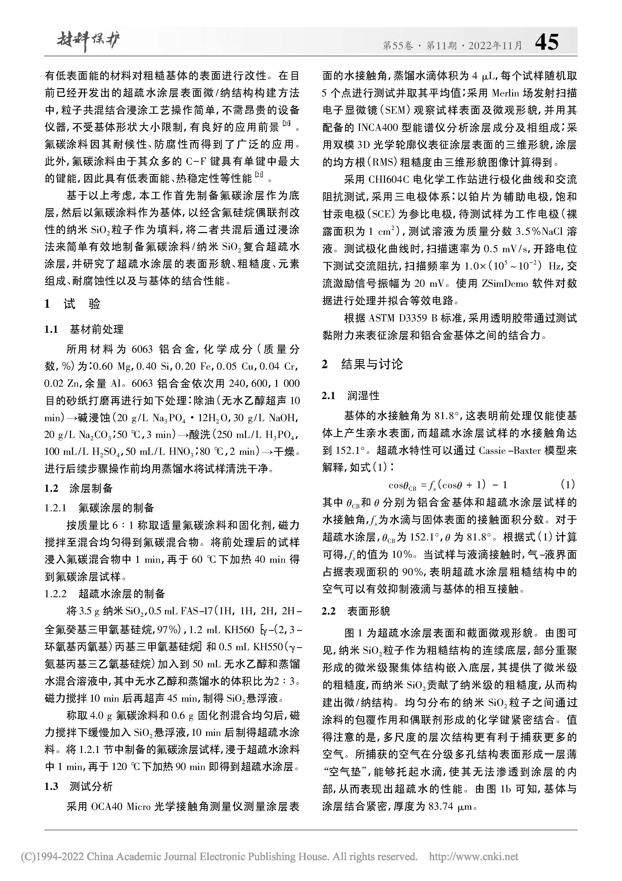 铝合金超疏水涂层浸涂法制备及其耐蚀性能