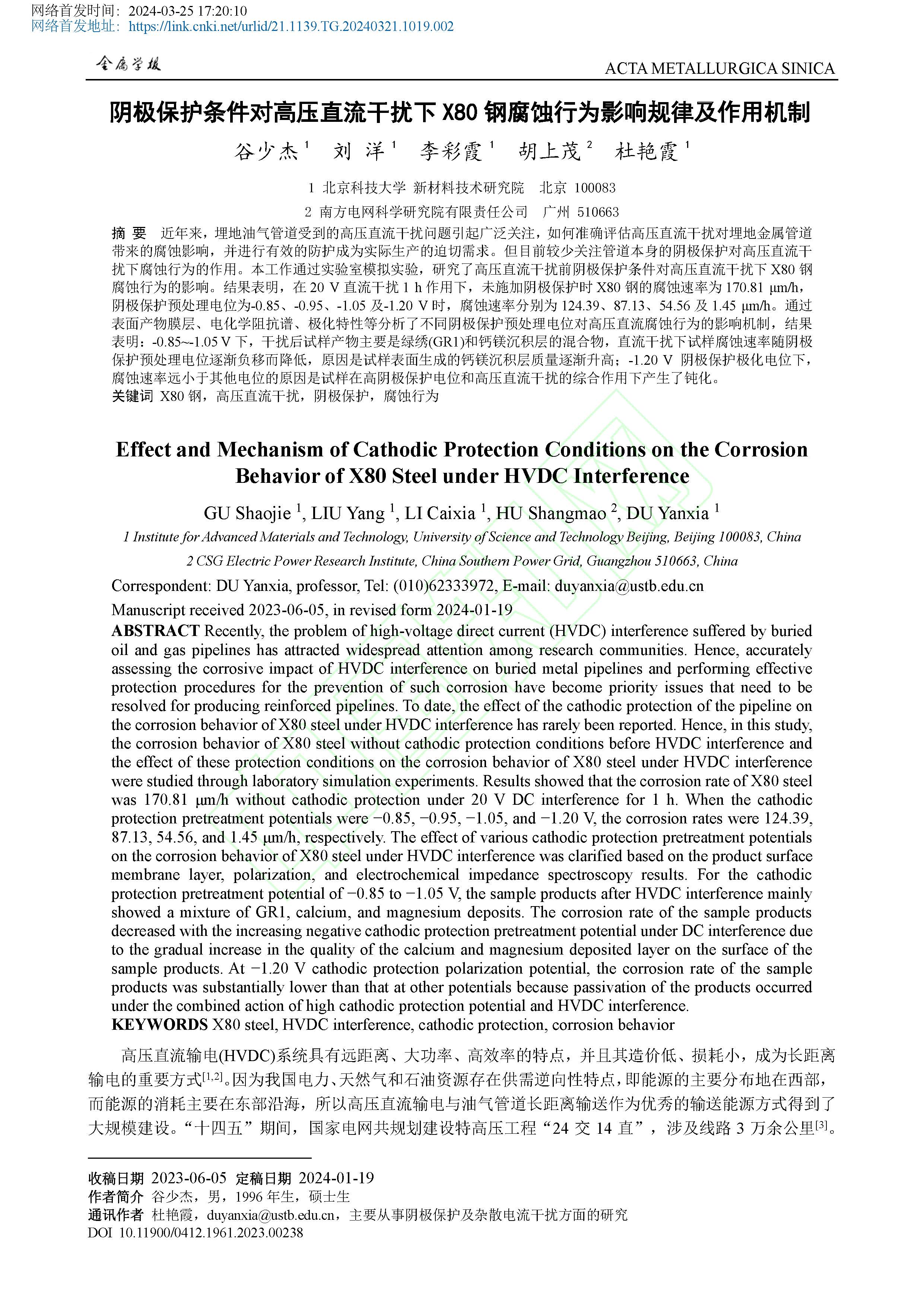 阴极保护条件对高压直流干扰下 X80 钢腐蚀行为影响规律及作用机制