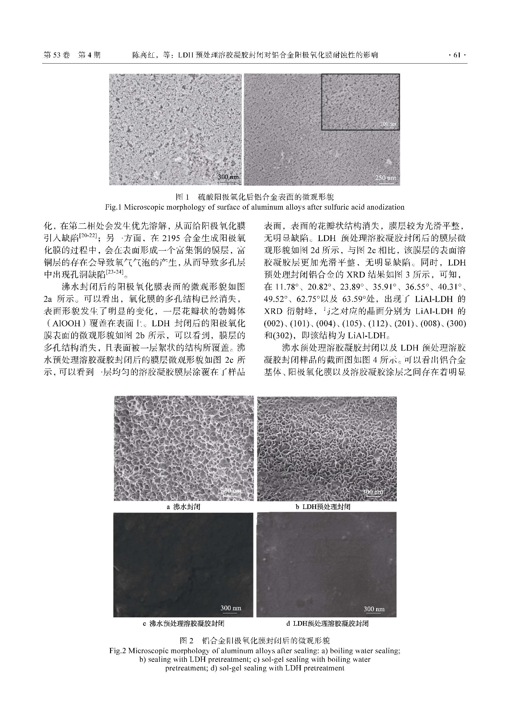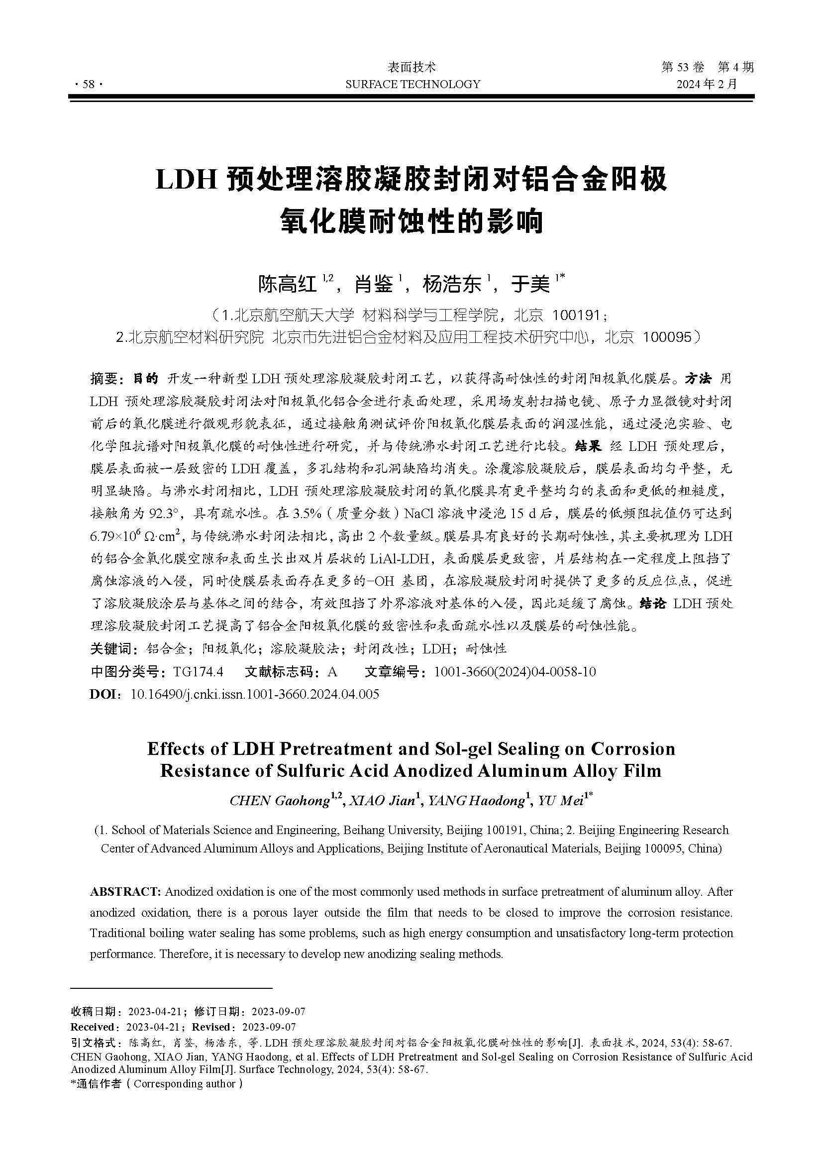 LDH 预处理溶胶凝胶封闭对铝合金阳极氧化膜耐蚀性的影