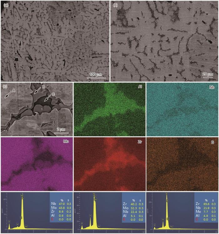 (2) AlNbMoZrB合金具有典型的树枝晶结构,枝晶区富集Mo、Nb和B元素为BCC结构基体相,而Al、Zr元素富集在枝晶间区,形成Al-Zr相及α-Zr相,B元素主要以间隙原子的形式固溶在基体中。