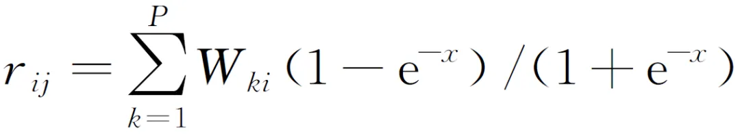 式中:i为人工神经网络的输入单元,i=1,…,m;j为神经网络的输出单元,j=1,…,n;k为神经网络的隐含单元,k=1,…,P;ωjk为输出层神经元j和隐含层神经元k之间的权重系数。