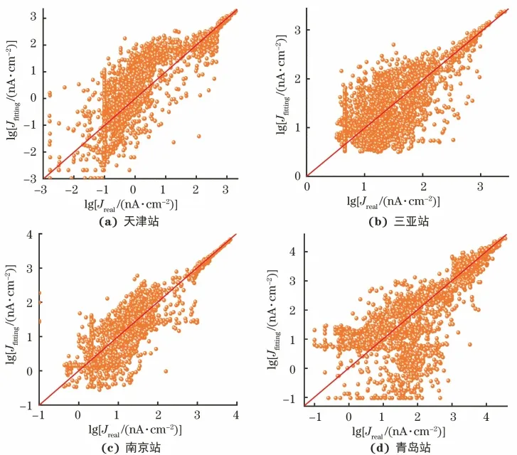 训练结果如图3所示,横坐标为ACM传感器输出的Q345碳钢腐蚀电流密度(真实值),纵坐标为ANN模型计算结果(拟合值)。总体而言,真实值与拟合值之间存在一定的线性关系,但是在4种典型大气环境中均存在一定的误差,表现出散点的分布离散性较大。