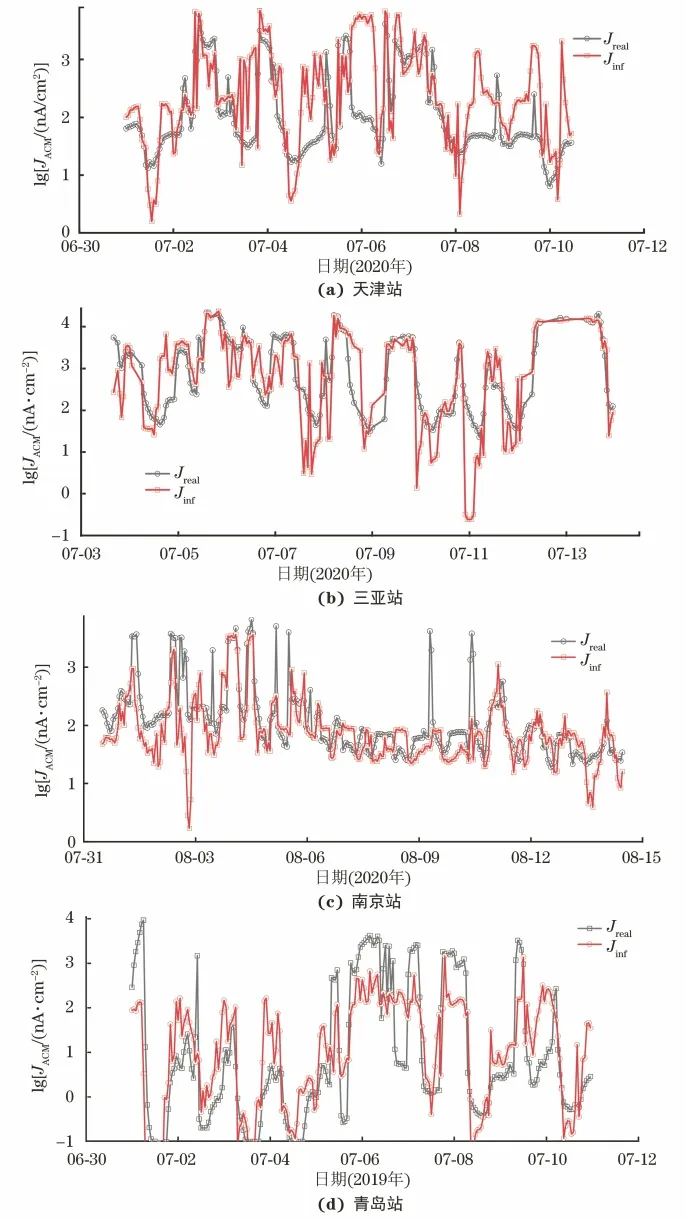 使用图3得到的ANN训练结果对某一时期Q345碳钢的腐蚀速率进行预测,预测时输入的环境数据为随机选取的一段时间内4个站点的环境数据,将预测结果与ACM传感器监测得到的同时期Q345碳钢的腐蚀电流密度进行对比,结果如图4所示。