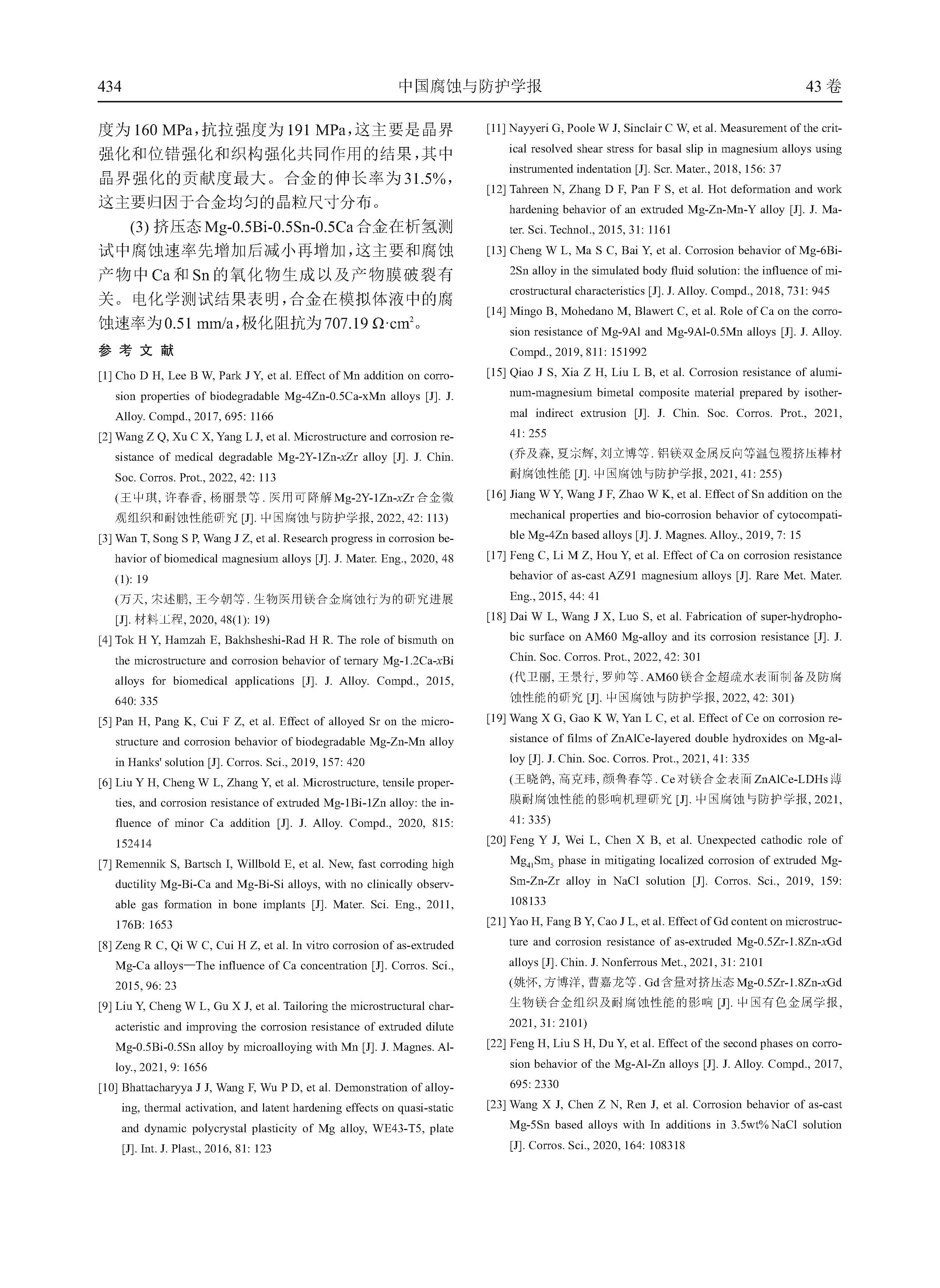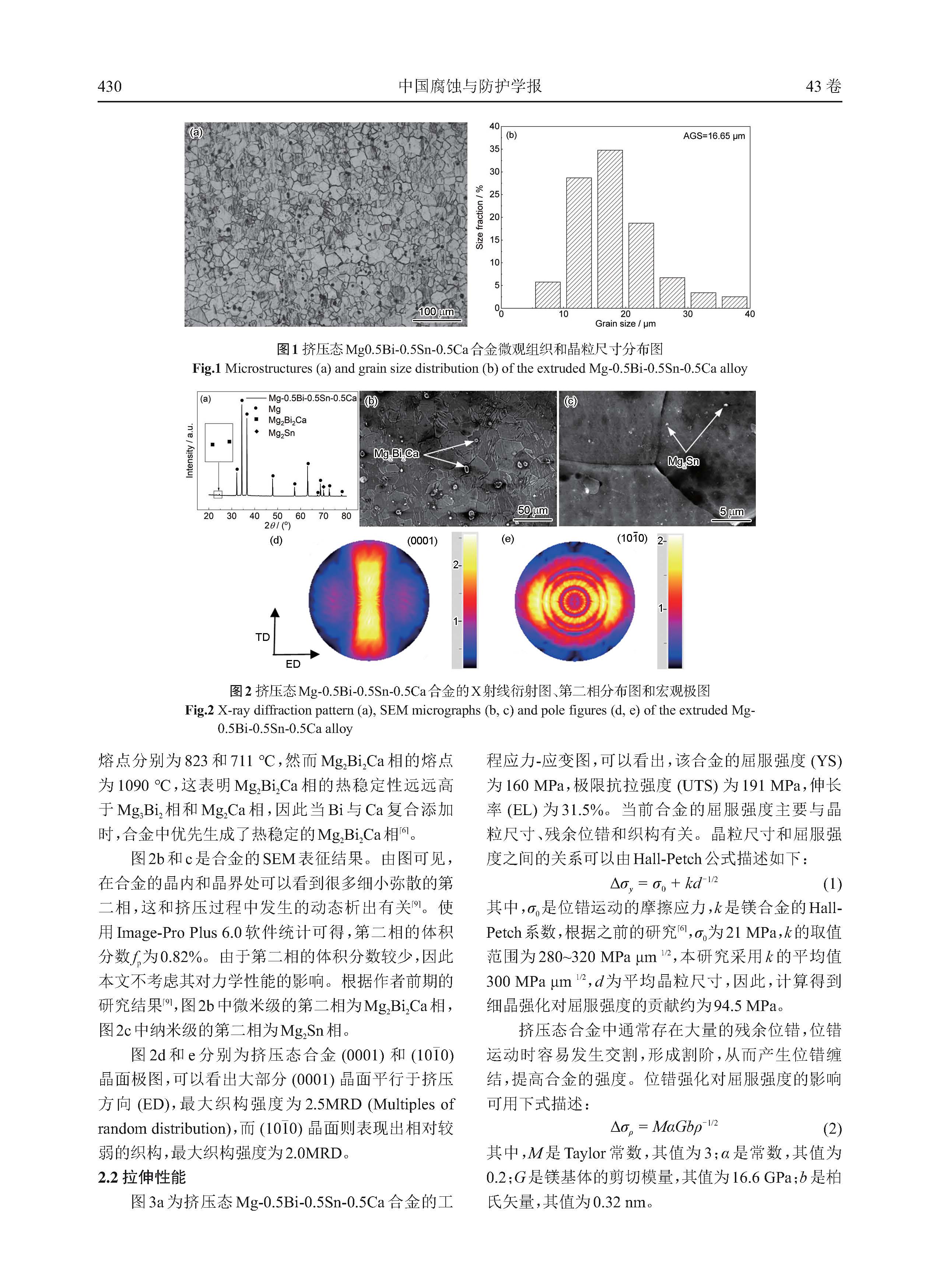 挤压态低合金化Mg-0.5Bi-0.5Sn-0.5Ca合金的力学性能及腐蚀行为研究