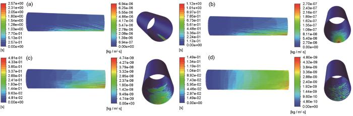 图1是腐蚀介质以0.6、1、1.5和2 m/s (颗粒0.3 mm,0.15%,Total Flow Rate为0.011 kg/s) 流动时CFD模拟得到的管道内壁腐蚀区域预测云图和固体粒子运动轨迹线图。由固体粒子运动轨迹线图可知:在重力作用影响下,固体粒子出现在管道底部的概率大于管道顶部,且越靠近出口处沉积现象越明显,因此在腐蚀预测云图中管道底部腐蚀较顶部严重、管道出口处腐蚀较入口处严重;因流体速度越大携带能力越强,随着入口流速的增加,粒子在底部的沉积现象变弱,其在管内的分布更均匀。结合腐蚀速率预测云图可知,粒子浓度越大的位置,冲刷腐蚀速率越大。