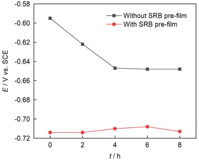 图2为35 ℃下L360钢试样在有无SRB预膜情况下的OCP随时间变化曲线。由图可知,未预膜试样OCP随冲刷时间延长产生负移,4 h后电位基本达到稳定,未预膜试样OCP负移是由于流体的冲刷作用导致腐蚀溶液中的SRB不能很好的吸附在金属表面形成具有保护性的膜层,在流体冲刷作用下金属发生腐蚀;4 h后随着腐蚀位点的形成,为SRB在金属表面的附着创造了条件,试样表面形成的腐蚀产物膜和微生物膜减弱了碳钢表面的传质过程,OCP逐渐达到稳定。与初始相比,流体冲刷8 h后试样OCP负移约50 mV。预膜试样因预先在SRB菌液中已形成较为均匀的膜层,使试样有较好抵挡流体冲刷的能力;其OCP在测试时间内较为稳定。
