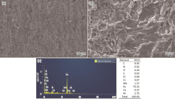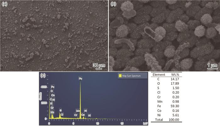 图6为预膜试样冲刷8 h后的表面腐蚀形貌。可以看出,工作电极表面覆盖着较为光滑的腐蚀产物和生物膜的混合膜层,放大后可清晰地看到呈短棒状的SRB,且膜层致密、破坏程度小。预膜试样的腐蚀产物膜较未预膜试样腐蚀产物膜致密,较为致密的腐蚀产物膜降低了试样的腐蚀程度。通过EDS扫描可知,C和O的含量较高,由此可见,腐蚀产物膜和生物膜中存在有机物,其主要来源是SRB细胞,SRB胞外聚合物等。同时Fe、S和P含量较高,说明主要腐蚀产物可能为有机物和FeS混合物以及少量的磷化物。但预膜组S的质量含量 (1.50%) 大于未预膜的 (0.63%),说明预膜组的工作电极发生SRB腐蚀的程度更大。