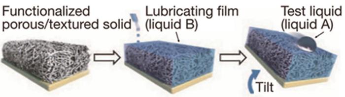 图5 向多孔固体注入具有低表面能、化学惰性的液体形成均匀的SLIPS[55]