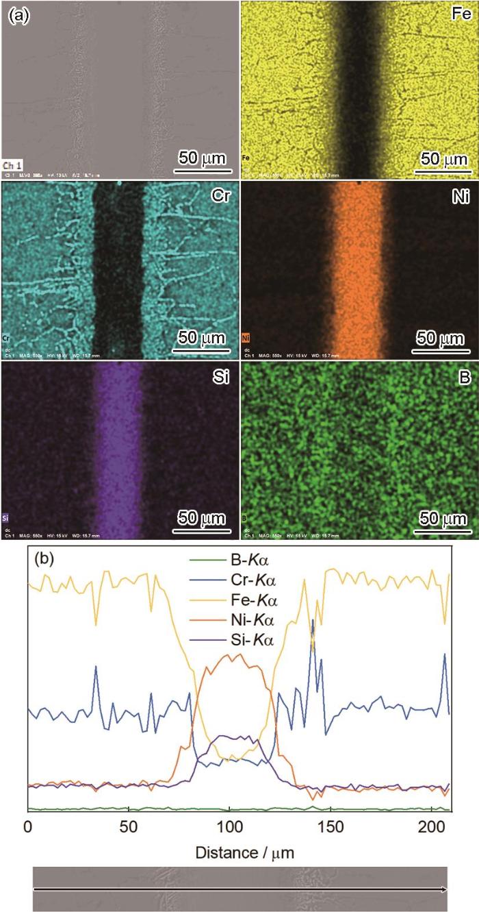 接头成形良好,无明显微观空洞,焊缝主要由镍基固溶体组成,未有金属间化合物相形成,钎料与母材发生明显的扩散,1Cr18Ni9Ti与钎料的界面发生显著的反应,钎料中的Si富集在焊缝中,少量向母材中扩散焊。少量的Fe向焊缝中扩散,Cr在焊缝附近的晶界中析出,在扩散区域的晶粒较母材有所长大,如图5a和b所示。