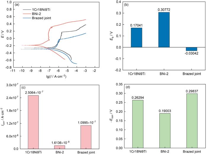 (2) 1Cr18Ni9Ti和BNi-2钎料的点蚀电位高于接头材料,说明钎焊后材料的抗点蚀性能降低。BNi-2钎料的腐蚀电位高于1Cr18Ni9Ti,说明BNi-2钎料的耐蚀性能高于基体。微区电化学测试结果同样证明,钎焊焊缝的腐蚀电位高于两侧基体。