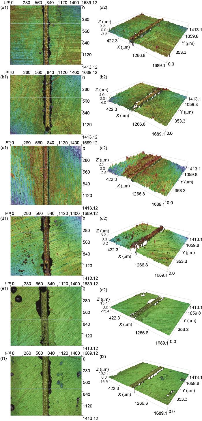 在1、3、6、10、15、20 d盐雾实验后采用激光共聚焦显微镜观察去除表面腐蚀产物的1Cr18Ni9Ti焊接接头形貌,如图6所示。在任何腐蚀时间内,焊接接头的高度均高于母材,说明焊接接头的耐蚀性高于母材,这与电化学测量结果相吻合。图7给出了盐雾腐蚀后钎焊接头与1Cr18Ni9Ti母材的高度差。随着时间的增加,焊缝和母材的高度差值逐渐增加,由腐蚀1 d的1.5 μm逐渐增加至3 μm。此外,在焊缝与母材的交界部位,靠近母材的部位存在许多点蚀坑,且点蚀坑的数量随腐蚀时间的延长而逐渐增加。
