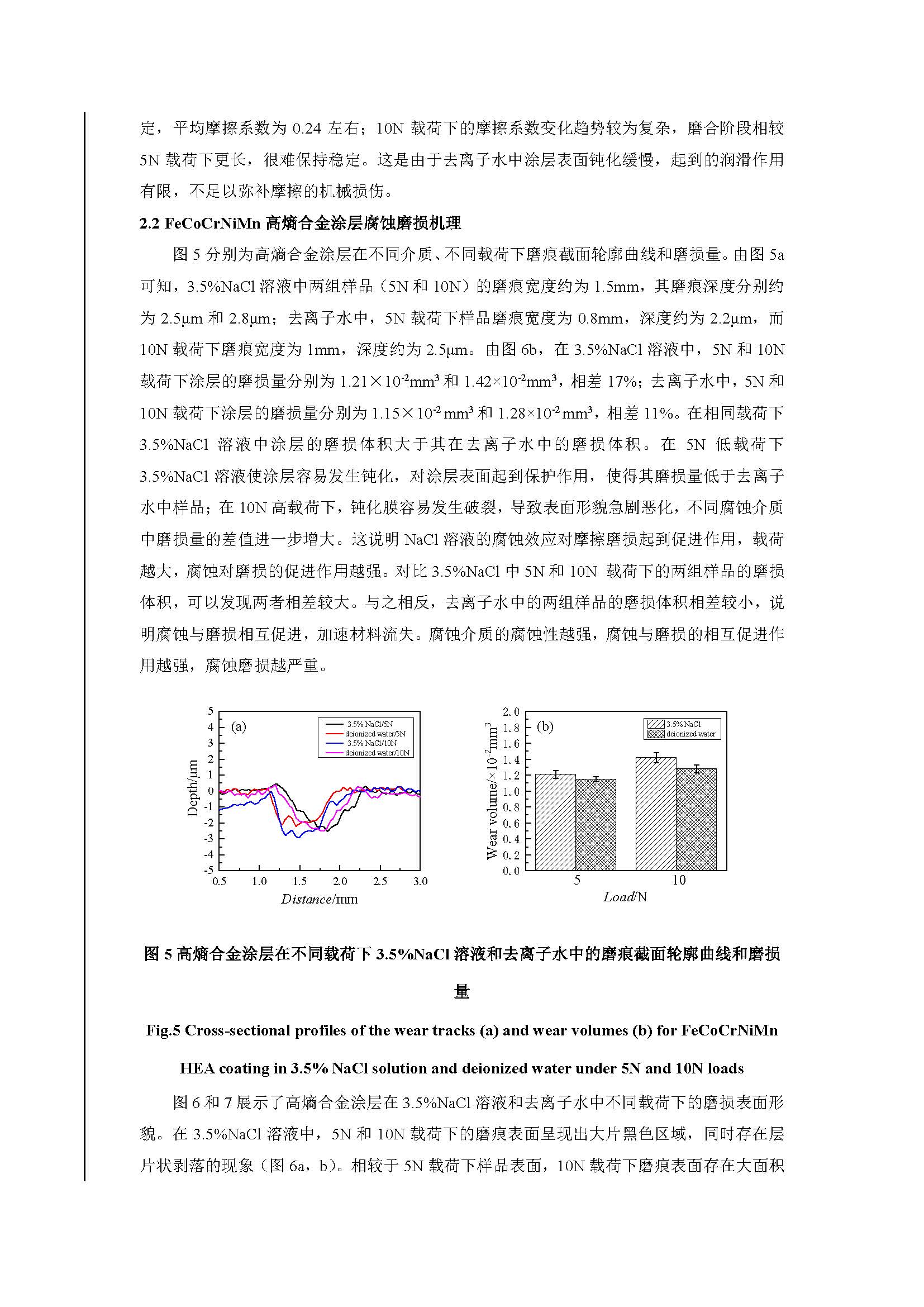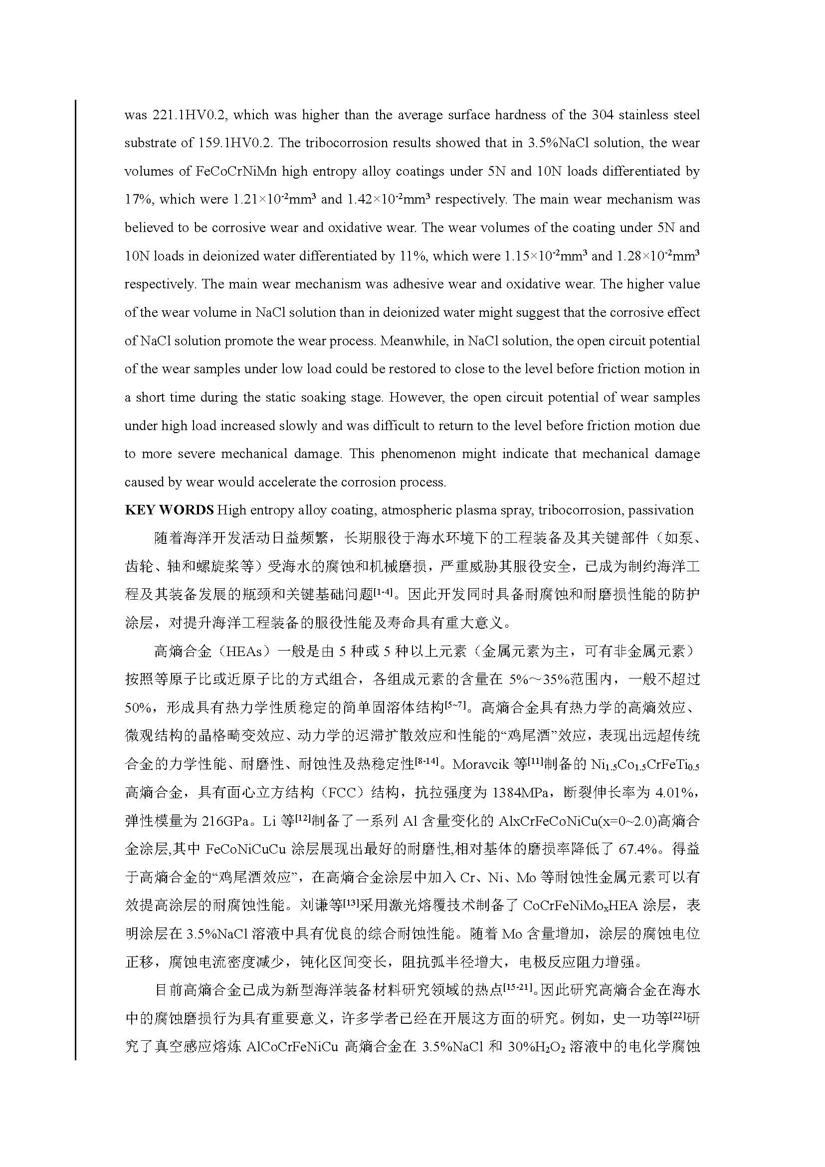 等离子热喷涂FeCoCrNiMn高熵合金涂层的腐蚀磨损性能