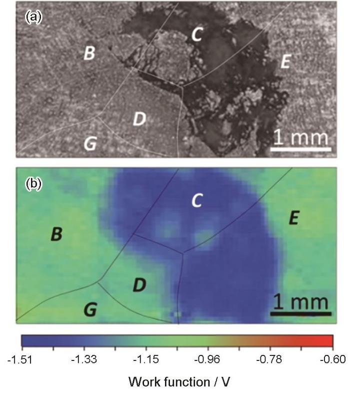SKP是基于振动电容测试功函数的一种非破坏性、非接触的技术,可以提供金属表面的局部信息。SKP测量可以在真空、露天、潮湿的空气中进行,也可以在表面滴一滴电解液。为了克服分辨率低的问题,开发了扫描Kelvin探针显微镜(SKPFM),其空间分辨率可达约0.1 μm,然而SKPFM测量更容易受到针尖与表面距离、表面形貌和针尖表面污垢/氧化所产生的人为因素的影响。如图6所示,Song和Xu[30]利用SKP技术表征了在0.01 mol/L NaCl溶液中浸泡0.5 h后镁表面腐蚀的位置,但该位置与实际光学图片拍摄的发生腐蚀的并不完全一样,认为表面薄膜的存在降低了SKP测量检测衬底Mg伏特电位差的灵敏度。另外,该技术还用于测试异种金属间的电偶腐蚀情况,Wu等[41]采用SKPFM测试了磁控检测的纯Mg和中间相Mg-28Al之间的电位差,结果显示磁控溅射纯镁表面电势的平均值与Mg-28Al表面电势的平均值之间相差242 mV。