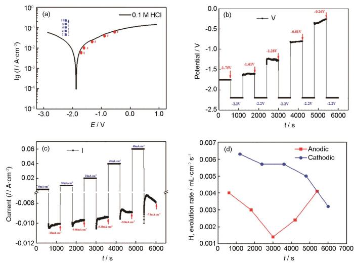 在镁合金阳极析氢或负差数效应的研究中,恒电流/电位极化结合析氢测试时最常用的方法[15,20,21]。恒电流/电位极化是给样品施加一个固定的电流密度/电位,测量腐蚀过程的电位/电流变化。当研究特定过程时,须使用恒电位极化测量,包括在镁表面电沉积不同物种形成保护涂层,以及在阳极极化过程中研究析氢速率,即负差数效应。Birbilis等[20]研究了在0.1 mol/L NaCl溶液中阳极极化后的纯Mg立即被阴极极化,表明与没有阳极极化的纯Mg相比,阳极极化后纯Mg的阴极电流密度显著增加,因此得出阳极极化导致产生的表面黑色腐蚀产物具有催化作用,增强了阴极析氢反应。如图4所示,Huang等[21]研究了在0.1 mol/L的HCl溶液中Mg的交替阴阳极极化析氢行为,可见在恒电流阳极极化过程中测得的阳极析氢速率随外加阳极电流密度的增大先减小后增大。紧接的恒电位阴极极化过程中测得的阴极析氢速率随着外加阳极电流密度的增大而减小。上述结果可见,阳极极化后的Mg表面并没有增强阴极析氢活性,阴极析氢和阴极电流都没有增加。