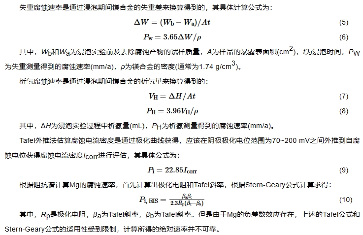 Mg的腐蚀速率是Mg腐蚀研究的一项重要指标。目前主要应用的腐蚀速率测试方式分为失重速率、析氢速率、Tafel外推法估算腐蚀速率和阻抗谱计算Mg的腐蚀速率等[6]。上述溶液法较为复杂、影响较多,并没有广泛采用。