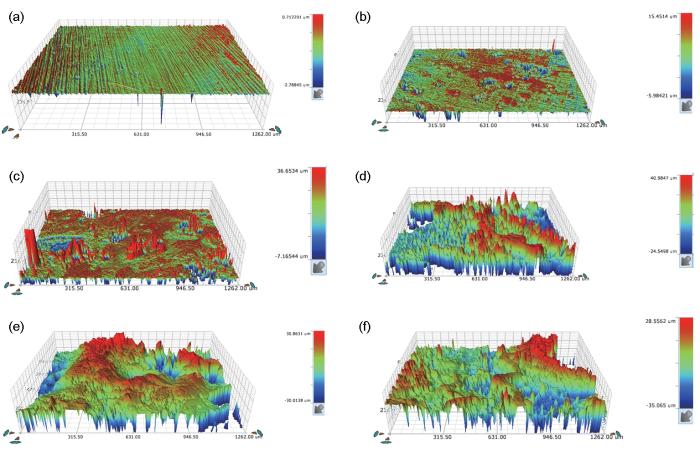 Fig.3 3D morphologies of WH-HMS after salt spray corrosion for 0 h (a), 12 h (b), 48 h (c), 96 h (d), 168 h (e) and 240 h (f)