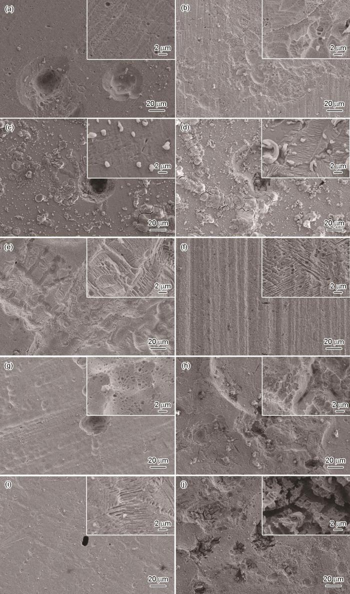 Fig.2 Surface morphology of WH-HMS for 12 h (a), 48 h (c), 96 h (e), 168 h (g), 240 h (i) and PT-HMS for 12 h (b), 48 h (d), 96 h (f), 168 h (h), 240 h (j) after salt spray corrosion