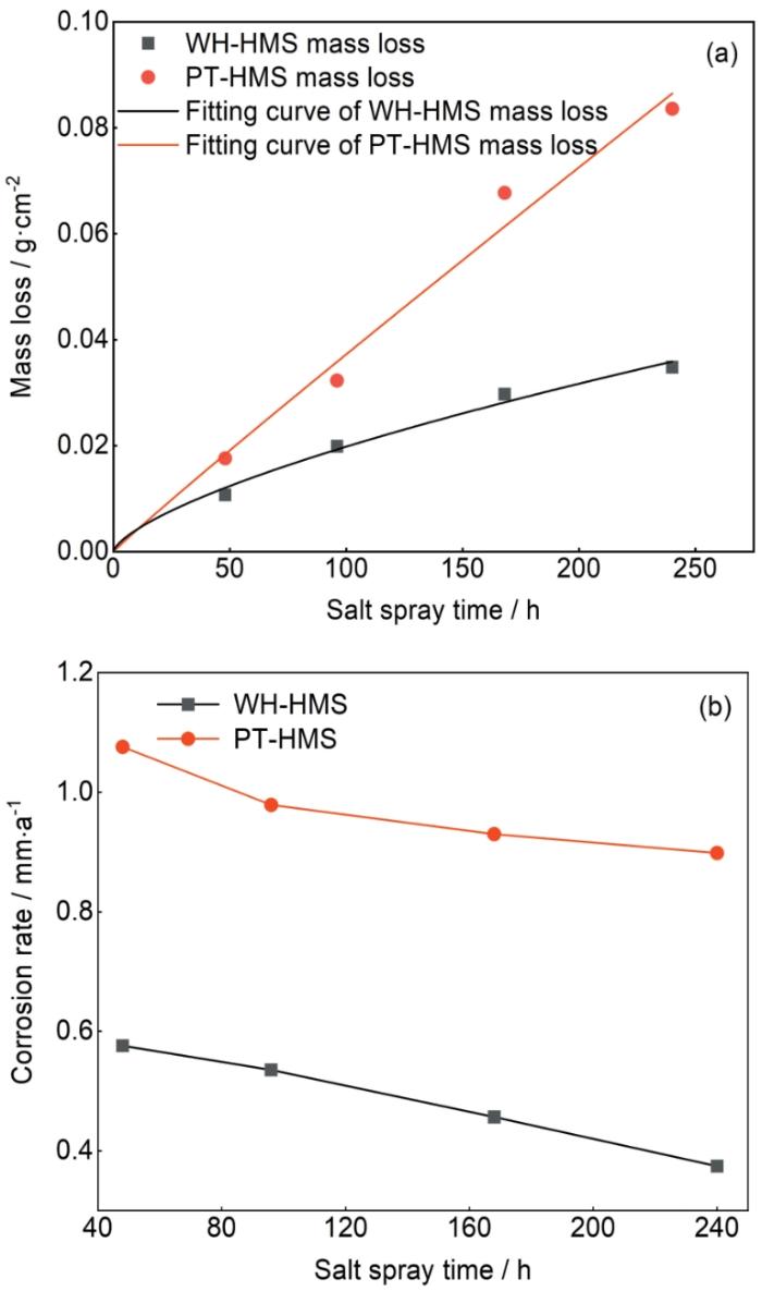 Fig.8 Variations of mass loss fitting curve (a) and corrosion rate (b) of WH-HMS and PT-HMS with time