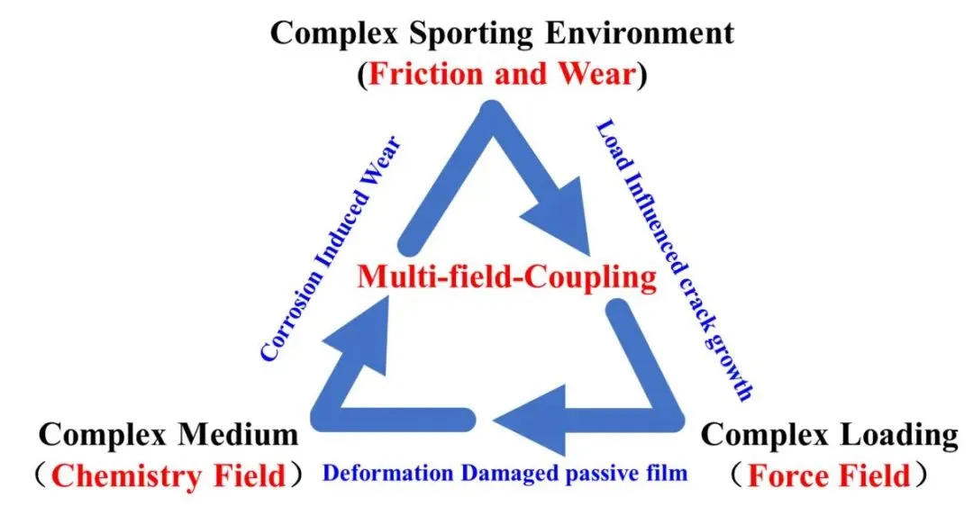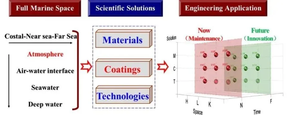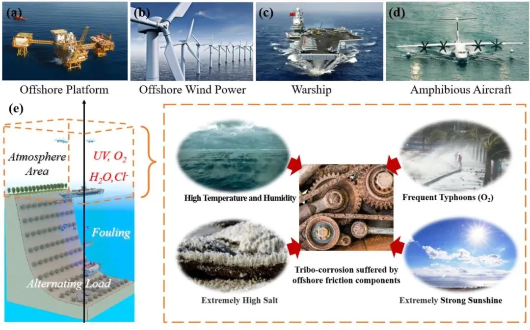 随着国家“南海海洋纵深开发”战略规划实施,国家海洋战略使命由近海扩展到远海及大洋,由我国自主研制的高技术装备已陆续列装南海,进入大批量服役阶段。海洋钻井平台、海上风电/核电、舰船和港口机械等国防与海工装备的机械运动系统部件直接暴露服役于海洋大气氛围中,受海洋气氛的化学/电化学引起的腐蚀以及力学因素引起的摩擦磨损交互作用,急剧加速了金属材料的损伤失效。 热带海洋气氛摩擦腐蚀挑战 ▷ 我国四大海域环境条件 我国大陆边缘的渤海(内海)、黄海、东海和南海互相连成一片,其海洋大气具有动态性和地域性等特点,受地球经纬度和海岸地理条件影响,温度、湿度、辐照度、氯离子浓度和盐度等主要环境因子及其耦合作用对材料服役行为的影响差异很大。 渤海(盘锦-唐山-天津-东营)为近封闭的内海,常年平均气温10.7 ℃,夏季水温24~25 ℃,冬季水温0 ℃左右,普遍有结冰现象,河口及滩涂区多堆积冰(高度可达2~3米),冰期1~3个月不等。3月初融冰时还常有大量流冰发生,流速为50 cm/s左右。渤海海水盐度仅为3‰,海面风浪较小。 整体来说,渤海区域舰船及武器装备面临的腐蚀工况较弱(低温、低湿、低盐、低紫外和弱台风),但在严酷的冬季,海洋工程装备外暴露部件及其防护涂层是否能经受高低温交变及极限低温冰冻(-20 ℃),钻井平台结构物及船用钢表面能否耐冰层冲击/刮擦,是渤海区域海洋环境适应性的关键难点。 黄海海域(青岛-日照-连云港-盐城)温度季节变化较为明显,1月最低(-2~6 ℃),8月最高(25~27 ℃)。其水温年变化小于渤海(15~24 ℃),海水盐度也比较低(32‰),且流入黄海的各河携带泥沙过多。黄海易受台风侵袭,水中含氧量为四大海域最高(达5.9 ml/L)。通过分析以上数据,黄海腐蚀工况较渤海苛刻,主要是温度、盐度及水含氧量有所提高,风力增强且伴随泥沙冲刷。 此海域服役的海洋装备需选用具有一定防腐蚀效果的表面防护手段,比如海洋钻井平台生活舱室常出现结露/凝水情况而引起金属腐蚀与电气绝缘降低,需采用有机涂层等具有绝缘耐蚀的防护手段;钻井平台的桩腿、海管和动力定位系统还应具备一定抗颗粒物冲刷性能,需考虑并选用“底+中+面漆”3层体系防护技术。 东海(舟山-宁波-福州-厦门)是中国、日本和韩国等国的海洋战略要地,属于亚热带和温带气候,有较高水温(年平均水温20~24 ℃)和较大的盐度(34‰左右),水中氧含量也较高(5.2~5.6 ml/L),且海中浮游生物的生长茂盛。 相比渤海与黄海海域,东海海域腐蚀条件明显增强(中温、中湿、中盐、较强紫外和较强台风),海洋装备部件需根据自身不同服役工况,针对性选择适宜的防腐蚀方案,比如海洋钻井平台结构件(静止暴露)受盐雾腐蚀、紫外照射和台风/海浪水雾冲刷等影响,其使用寿命大大降低;而升降滑轨、传动齿轮和桩腿/导管接头中的连接螺栓及系泊链(运动暴露)则同时面临磨损与腐蚀的双重考验,须重点研究其磨损腐蚀失效行为机理,并用耐磨防腐涂层材料进行表面防护。 南海海域(广东-湛江-三亚-西/南沙群岛)接近赤道,接受太阳辐射的热量较多,南海的年日照辐射总量接近7000 MJ/m2,约是其它海域的1.5~1.7倍;年平均温度高达27.5 ℃,约是其它海域的1.7~2.7倍;一年中气温大于30 ℃的天数高达160天,约是其它海域的3.0~25.5倍;年平均降雨量约是其它海域的1.3~2.4倍。南海是我国最深、最大的半封闭海,相比渤海、黄海及东海具有更为复杂多变的热带海洋性气候特点,湿度常年高达90% RH,海水盐度高达35‰,其气氛环境具有更高的饱和蒸气压及盐雾浓度(>300 mg/m2d)。在亚热带气候的万宁试验点暴露试验结果表明,传统Q235和Q345碳钢由于高氯离子含量致使锈层结构疏松;海洋平台高湿高盐的盐雾气氛对航空钢表面电镀Cd层穿透性更强,腐蚀更加严重。 南海诸岛在夏秋两季还常受强台风影响,台风狂虐,裹挟暴雨,掀起巨浪,给海工装备的承力结构物、连接紧固件/焊缝和运动滑轨/齿轮传动部件的使用可靠性带来极大挑战。针对南海高温、高湿、高盐及高紫外辐照的热带海洋区域,伴随海浪飞溅、泥沙冲刷及强台风冲击等极端苛刻工况,南海海洋装备需经历比其他海域更为复杂和严酷的贮存、运输和服役环境,南海工程性防护材料的性能数据及规律仍极度匮乏,其热带海洋环境适应性考核体系亟待建立。 ▷ 海洋装备面临严峻摩擦腐蚀挑战 然而,在南海海域服役的海洋装备外暴露关键摩擦副零部件受海洋盐雾气氛的化学/电化学引起的腐蚀以及力学因素引起的摩擦磨损交互作用,将急剧加速其损伤失效。目前的海洋工程用材料(如耐候钢、铜合金、铝合金和钛合金等)还不能完全满足海洋装备外暴露传动系统/部件在热带海洋气氛下高可靠性和长寿命运行的要求。 传统3层防护的防腐涂层技术(涂层厚度>400 μm)与表面处理技术(氧化、磷化、镀铬、镀锌、镀镍、镀镉及盐浴氮化等)可一定程度上提升工程金属材料的耐蚀性及服役寿命,但仍难以满足海洋高技术装备高冲击和高承载运动/传动系统的实际工程需求。 目前,涉及摩擦磨损与腐蚀交互作用的海洋装备部件失效难题亟待解决,比如,内陆用高技术装备于南海海域首次试用,仅静置72小时后,其焊缝和螺栓紧固件等部位(传统防腐漆防护)即出现锈蚀现象,运动传动系统的滑轨、弹簧及键/销等关键运动部件于200小时后出现润滑油降解及