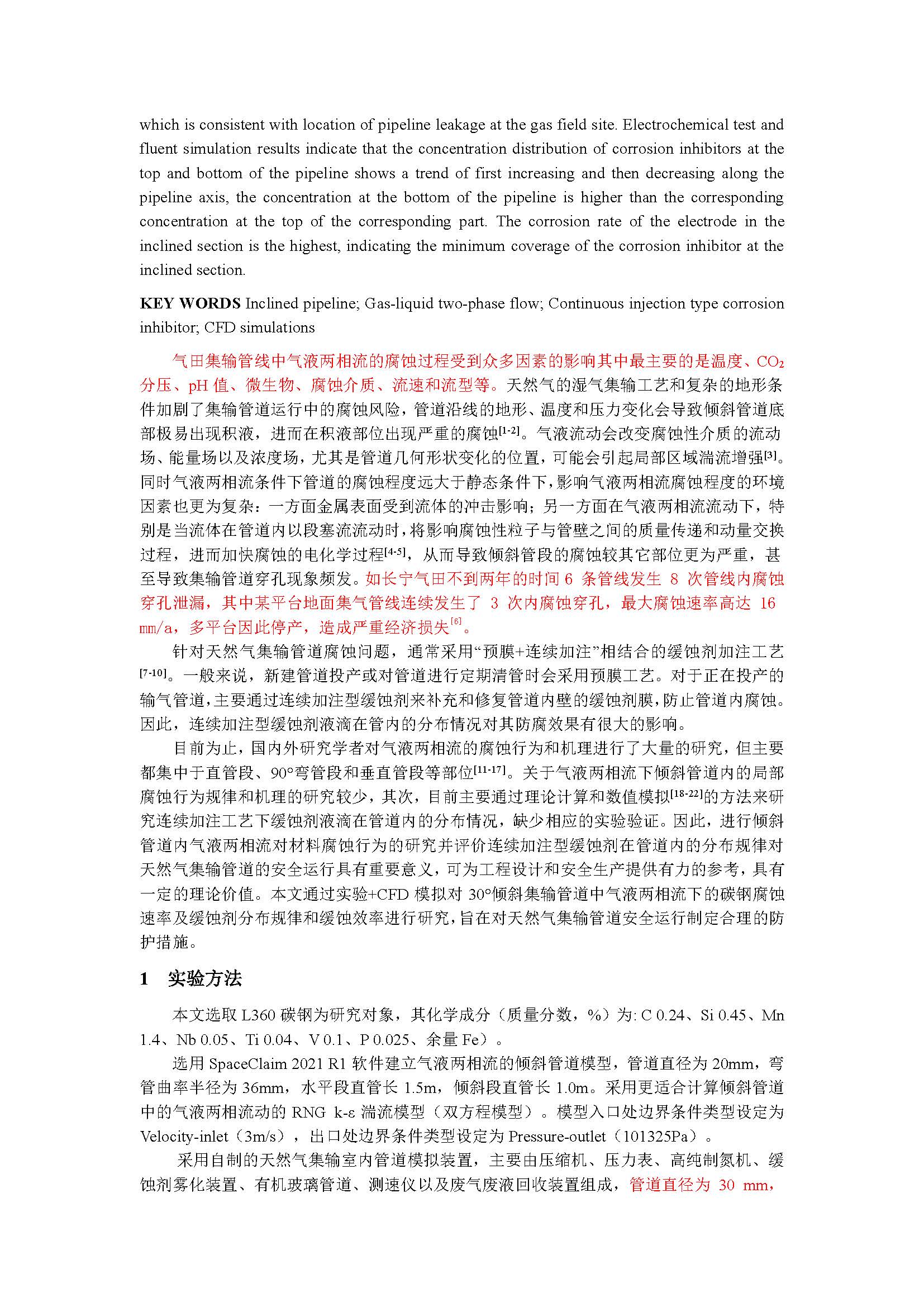 天然气集输倾斜管道腐蚀行为及缓蚀剂分布研究