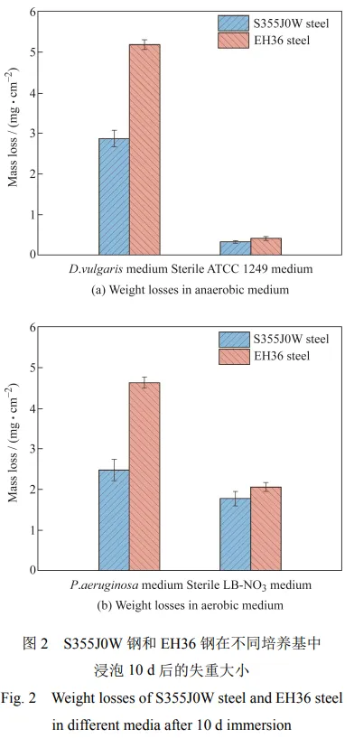 01 在厌氧脱硫弧菌培养基中,S355J0W 钢的失重和点蚀深度是 EH36 钢的 56%、70%。在好氧铜绿假单胞菌培养基中,S355J0W 钢的失重和点蚀深度是 EH36 钢的 54%、47%。S355J0W 钢中合金元素的共同作用导致其耐 MIC 性能明显优于 EH36 钢。
