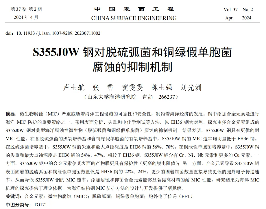 本文为山东大学海洋腐蚀与防护团队撰写发表在《中国表面工程》2024年第37卷第2期的研究论文,题为“S355J0W钢对脱硫弧菌和铜绿假单胞菌腐蚀的抑制机制”。