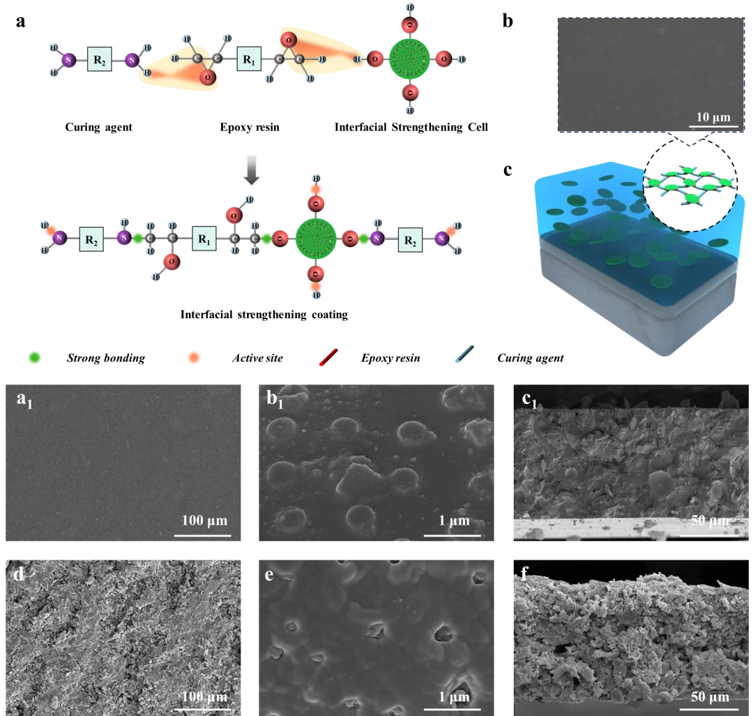 针对上述问题,东南大学张友法教授团队利用氢氧化铝修饰多孔微米级硅藻土颗粒并装载氟化纳米二氧化硅颗粒设计了一种具有多重协同效应的界面强化单元胞(IS-Cells)。超疏水IS-Cells富余的活性位点(-OH基团)和树脂的特征官能团反应生成共价键,增强涂层强度;氟化纳米二氧化硅颗粒增强涂层超疏水性,且在复合颗粒遭到物理破坏后释放,赋予涂层疏水自修复性。最终实现了长效的机械稳定性、耐蚀性和防污性。