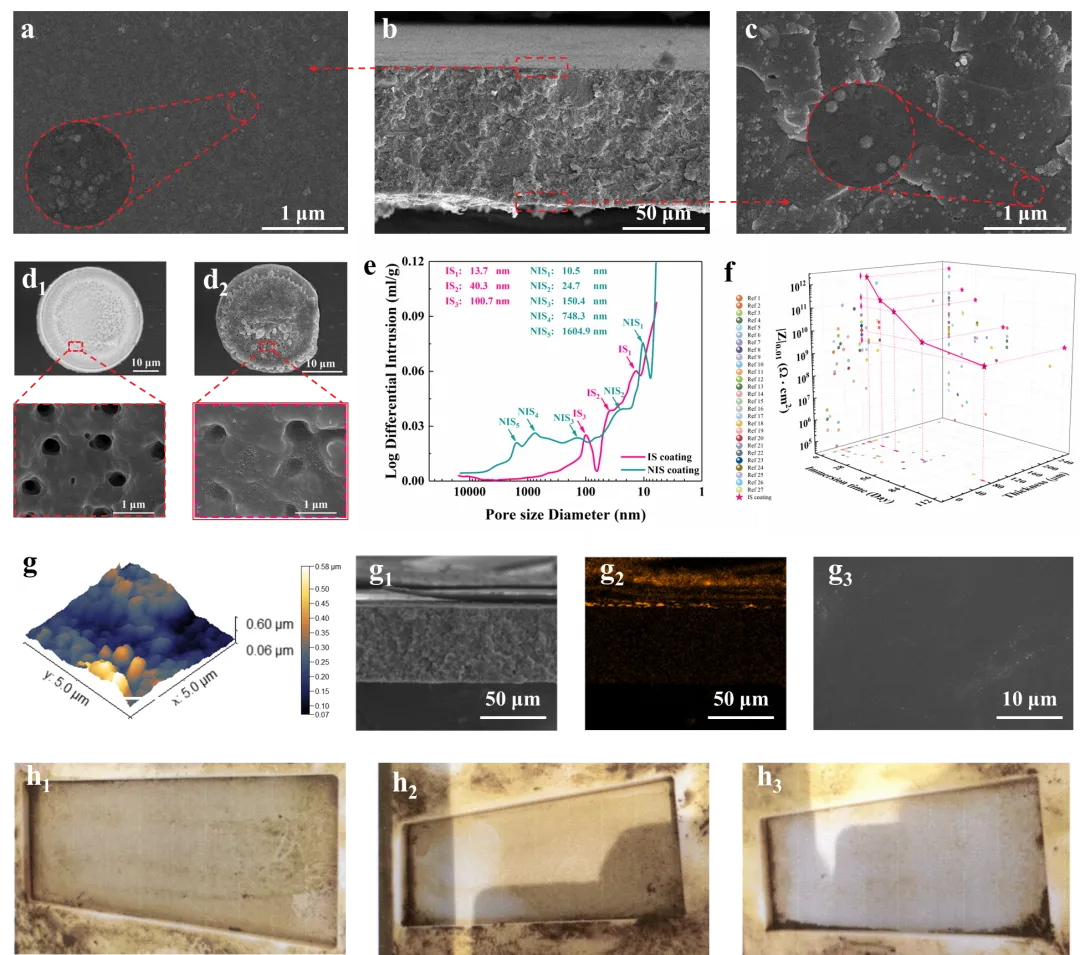 设计的界面强化涂层(IS Coatings)如图1a-b和a1-b1所示,富含羟基的超疏水IS-Cells可以和树脂基体进行化学交联,增强了超疏水IS-Cells与树脂的相容性,强化了涂层机械耐久性。IS-Cells的超疏水性以及内部装载的超疏水纳米颗粒,有助于增强涂层扩散阻力。且在涂层遭到物理破坏后,及时释放以增强损伤区域疏水性。片状的IS-Cells在涂层中均匀分布,还有助于实现传统的“迷宫效应”,延长扩散距离。这保证了IS涂层在多相腐蚀介质中优异的长效耐蚀性。与之形成鲜明对比的未特殊设计的超疏水单元胞(NIS-Cells)由于缺乏羟基,其与树脂产生了明显的相分离状态(图1d-f),使其仅具备短期的耐蚀性。