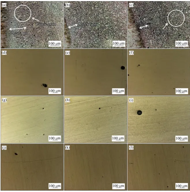图3不同摆动模式下焊缝光学显微形貌及焊缝纵截面气孔形貌:(a) 无摆动模式焊缝的光学显微形貌;(b) 三角模式焊缝的光学显微形貌;(c) “∞”模式焊缝的光学显微形貌;(d) (e) (f) 无摆动模式焊缝的气孔形貌;(g) (h) (i) 三角模式焊缝的气孔形貌;(j) (k) (l) “∞”模式焊缝的气孔形貌