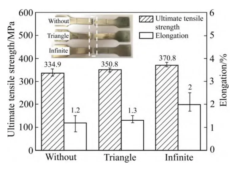 图6所示为不同摆动模式焊接接头的抗拉强度及伸长率。观察试样断裂位置,发现断裂位置均在焊缝靠近熔合区附近,原因可能如下:第一,焊缝区的硬度低于热影响区和母材,使之成为最容易断裂的位置;第二,熔合区附近的组织为指向焊缝中心的粗大柱状晶,焊缝区为等轴树枝晶,其组织不均以及柱状晶组织均不利于塑性变形,导致断裂发生。从图6中可以看出,无摆动模式、三角模式及无穷模式焊接接头的抗拉强度分别为 334.9 MPa、 350.8 MPa、 370.8 MPa, 伸 长 率 分 别 为 1.2%、1.3%、2%。无穷模式接头具有较高抗拉强度的原因可能如下:1) 晶粒细化产生更多晶界,可阻止裂纹扩展,提高力学性能;2) 该模式下接头的有效连接面积优于其他两种模式,如图2所示;3) 无穷模式下焊缝气孔较其他两种模式小。气孔的存在会显著降低力学性能。结合焊接接头宏观形貌结果,无穷模式接头过渡平滑可以有效避免因尖锐或凹陷处的应力集中而产生的裂纹源。这也可能是无穷模式接头抗拉强度高于其他两者的原因。