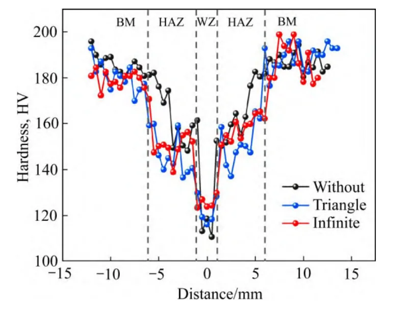 图5所示为不同摆动模式下焊接接头的硬度分布。从曲线整体来看,三种模式下焊接接头的硬度分布均以焊缝为中心呈对称分布,焊缝处硬度值最低(约120HV),其次为热影响区(约150HV),母材处硬度最高(约180HV)。结果表明,无摆动模式焊缝硬度值最低,无穷模式最高。这个结果说明增加摆动有利于细化焊缝晶粒,达到细晶强化,从而提高焊接接头力学性能的目的。