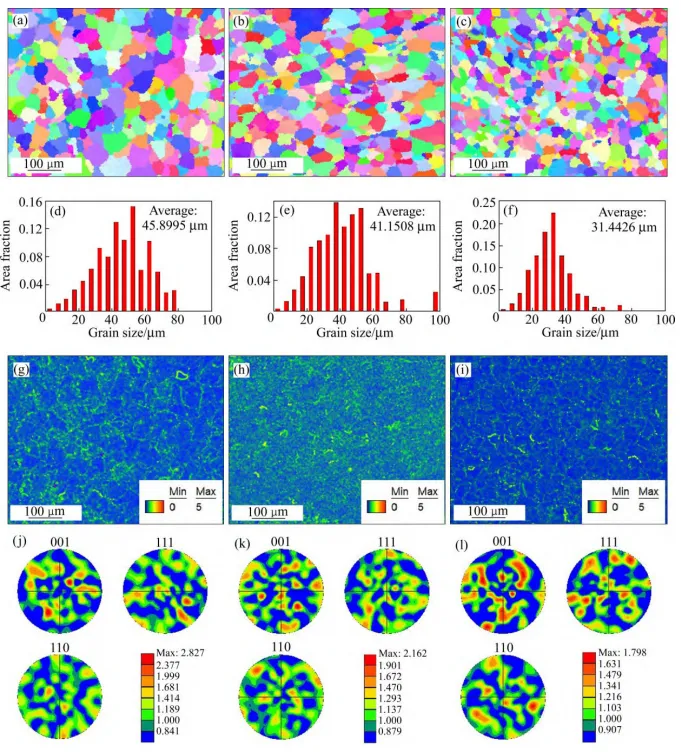 图4 不同摆动模式下焊缝的反极图、晶粒尺寸统计图、KAM图和极图:(a) (d) (g) (j) 无摆动;(b) (e) (h) (k) 三角;(c) (f) (i) (l) “∞”