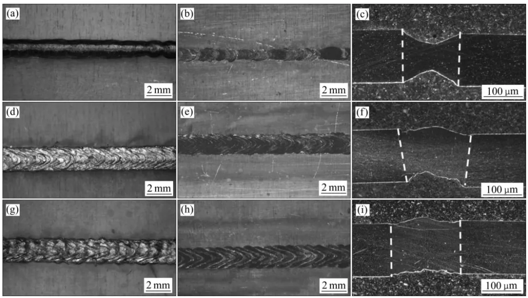 图2 不同摆动模式焊缝正反面及横截面形貌:(a) (b) (c) 为无摆动模式的前、后、横截面;(d) (e) (f) 为三角摆动模式的前、后、横截面;(g) (h) (i) 为“∞”摆动模式的前、后、横截面