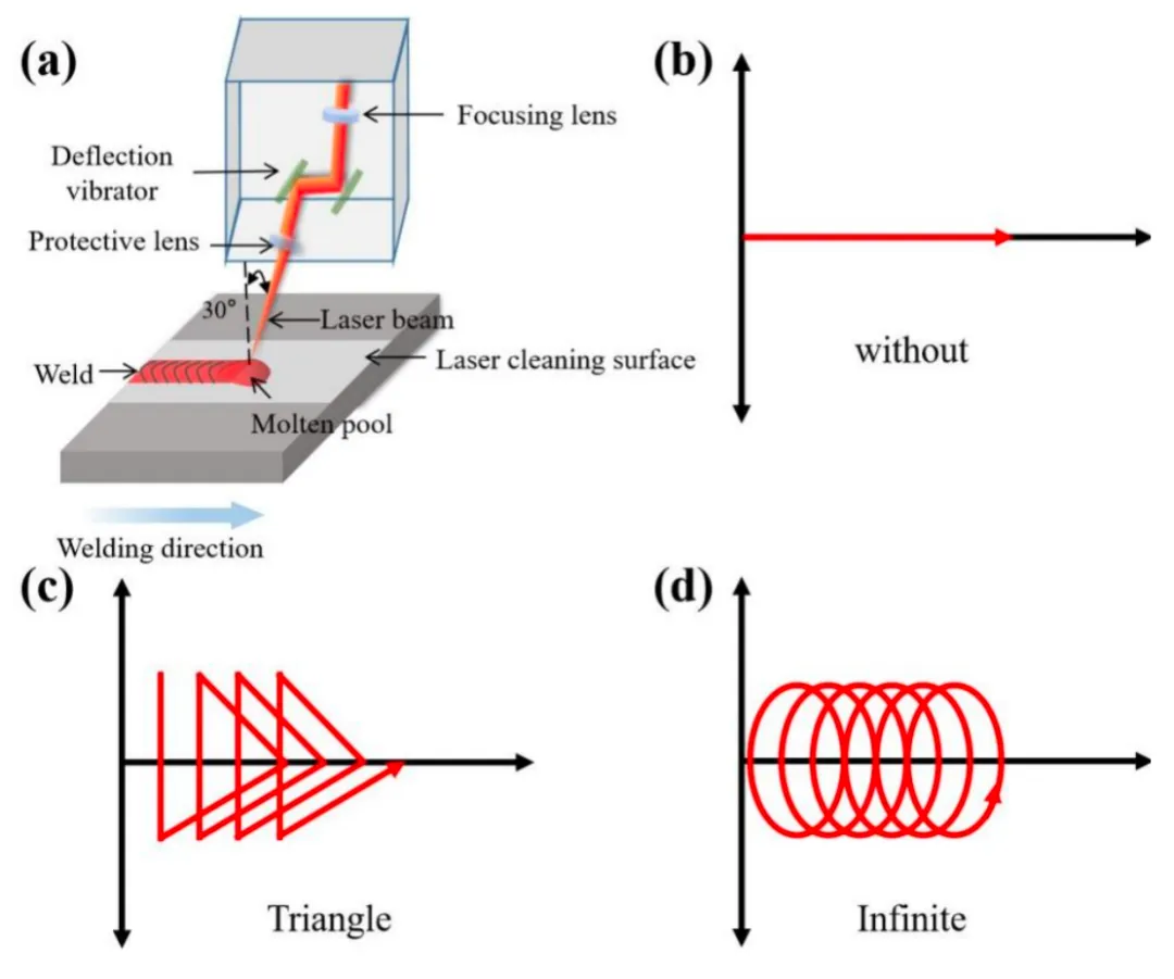 图1 摆动激光焊接示意图及焊接路径:(a) 摆动激光焊示意图;(b) 无摆动模式路径;(c) 三角模式路径;(d) “∞”模式路径