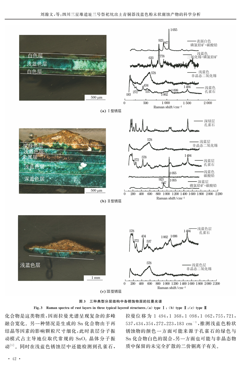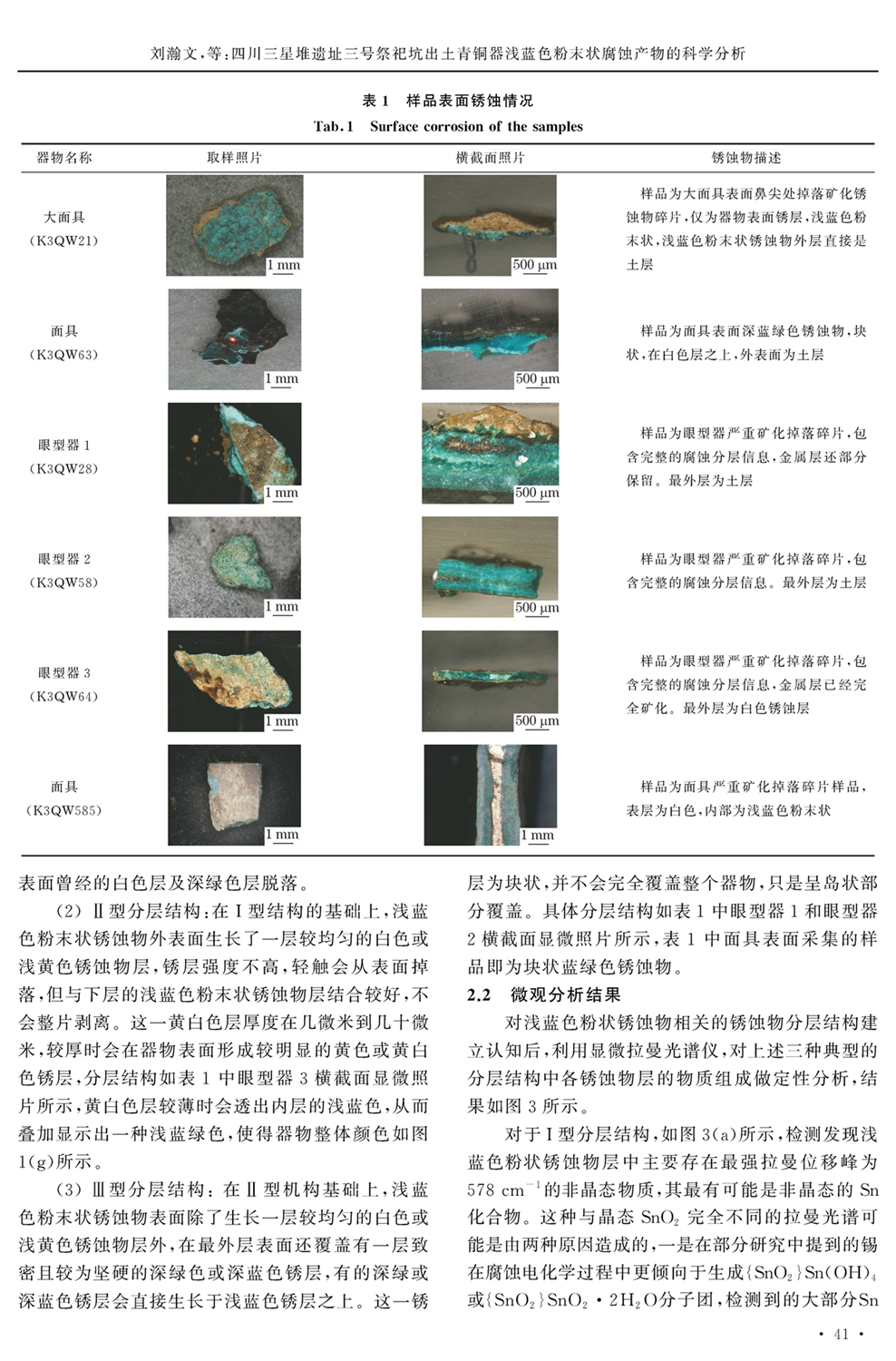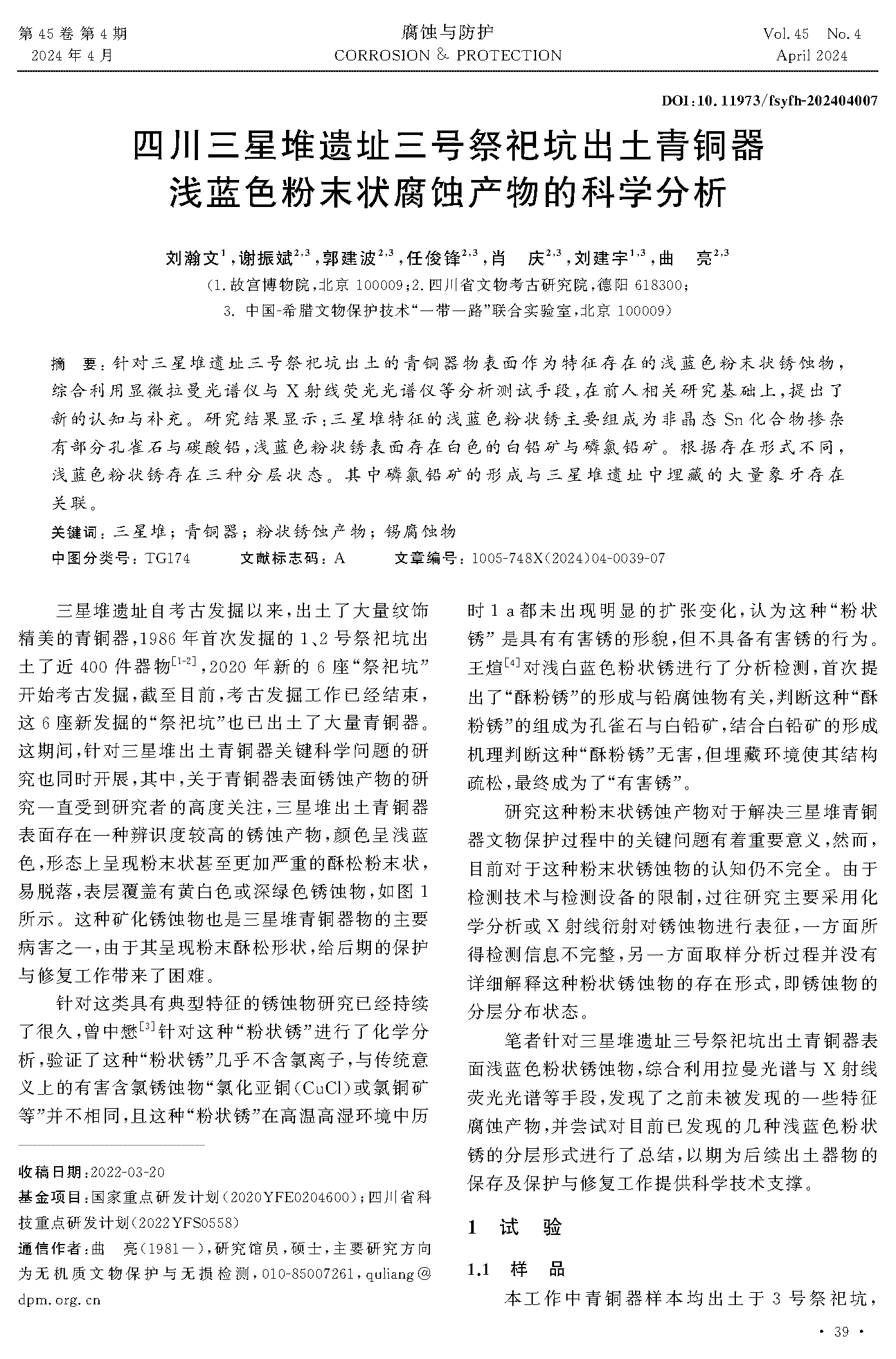 四川三星堆遗址三号祭祀坑出土青铜器浅蓝色粉末状腐蚀产物的科学分析