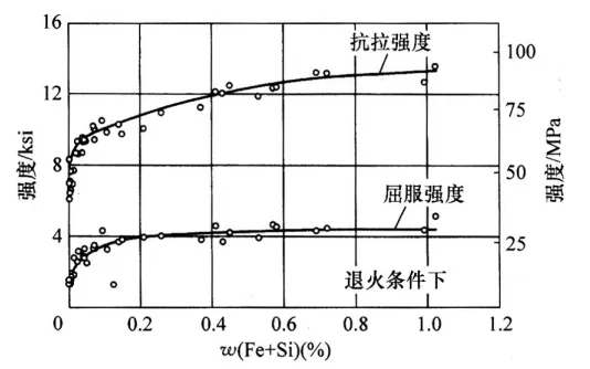 铝合金中铬的质量分数一般不超过0.35%。如超过该成分范围,则会发生包晶反应,形成极粗大的初生相 Al7Cr。商用合金中的合金元素和杂质元素可能会降低铬在铝中的固溶度,使Al7Cr初生相在包晶反应中形成。铝合金中铬的上限值取决于其他合金和杂质元素的数量和性质。如铸造铝合金含有过量的铬,则会因其在包晶反应过程中停留而产生残存的相。 在AI-Mg、AI-Mg-Si和Al-Mg-Zn合金体系的许多合金中,铬是常用的合金元素。铬形成细小颗粒相,在不可热处理强化铝合金中,有利于细化晶粒,提高合金的强度;在可热处理强化铝合金中,可控制晶粒尺寸和再结晶程度。由于铬的扩散速度慢,在变形铝合金中形成了细小弥散相。对5xxx系列合金,在(铸)锻锭预热过程中形成面心立方的 AlsMg;Cr弥散相;在7xxx合金中,弥散相的成分则更接近于Al1MgzCr。这些细小弥散相抑制了 A1-Mg合金中的形核和晶粒长大,并阻碍了Al-Mg-Si合金和Al-Zn合金在热加工或热处理过程中发生再结晶。在可热处理强化铝合金中,铬的主要缺点是增加了强化相在已存在的铬颗粒处的析出倾向,由此增加了合金的淬火敏感性。 铜在铝中具有相当大的固溶度,具有明显的析出强化作用,因此,铜是铝合金中最重要的合金元素之一。二元铝-铜合金体系是典型的析出强化例子,是最受关注的研究系统之一。尽管如此,实际上很少看到商用二元铝-铜合金。大多数商用铝-铜合金都含有其他合金元素。通常,铝-铜合金体系含有铜(质量分数为2%~10%)和其他合金元素,包括2xxx变形铝合金系列和2xx.x铸造铝合金系列。此外,许多其他可热处理强化铝合金中也含有铜。根据合金中其他成分的不同,铜的质量分数为4%~6%时对铝合金的强化效果达到最大。不同热处理条件下铝-铜合金薄板的性能如图 1所示。 图1 高纯度变形铝-铜合金的拉伸性能 注:薄板试样宽13mm(0.5in)宽,厚1.59mm(0.06in)。0-退火;W一固溶水淬后立即测试;T4-固溶水淬后在室温下时效;T6-在 T4后高温时效。 与其他合金体系相比,对二元铝-铜合金的时效特性已进行了较为详细的研究,但很少有商用的二元铝-铜合金。大多数铝-铜合金都含有镁等其他合金元素。在铝-铜合金中加入镁的主要优点是,通过固溶淬火能进一步提高合金的强度。如对某些变形铝合金进行室温时效,在提高合金强度的同时还能提高其塑性。如对合金进行人工时效,则可获得更高的强度,但塑性会有所降低。在铸造和变形铝合金中,添加质量分数约为0.05%的镁,能有效提高合金的时效强化性能。 在精炼铁钒土和熔炼生成氧化铝后,铁作为杂质元素残存于铝合金中,因此,实际上所有铝合金中都会残存一定的铁元素。铝-铁二元合金体系的共晶成分为w(Fe)=1.8%,在共晶温度655℃(1211℉)下,铁在铝中最大的固溶度为0.05%。尽管可能存在其他相,在固溶度极限温度出现的平衡相是Al3Fe(θ)。根据凝固速率和存在锰等其他合金元素,合金中可能出现亚稳相。如采用适中的速率淬火冷却,则出现FeAl6相;快速火冷却时出现 Fe2Al9相。铝中铁的固溶度非常有限,因此常用作导电材料。固溶的铁使铝的强度略有提高,在温度略有升高的条件下,将具有更好的抗蠕变性能。虽然铝合金中存在少量的铁可减少压铸过程中出现的焊合危害,但通常在铝-硅铸造合金中,铁会形成粗大的富铁相,因此通常不希望铝-硅合金中含有铁。 由于铝合金中总是会残存少量的铁,铁在铝中的影响应根据三元或四元相图来分析。随着添加其他合金元素,铁在铝合金中的固溶度会进一步降低在大多数铝合金中,铁的最大固溶度可降低到w(Fe)=0.01%或以下。由于铁和硅是工业纯铝中常见的杂质元素,因此,人们非常注重对A1-Fe-Si三元相图的富铝角的研究。在硅含量低的情况下几乎所有的铁元素都形成 Al3Fe 相。 铝-镁合金是变形5xxx系列和铸造5xxx系列中,不可热处理强化铝合金。合金中的镁能提高固溶强化效果,而不会过度降低合金的塑性。铝-镁合金具有优异的固溶强化和耐蚀综合性能,通过形变强化,变形铝合金的强度得到了进一步提高。目前,5xxx变形铝合金系列中镁的质量分数不超过5.5%,而铸造铝合金中镁的质量分数为4%~10%。当铸造铝合金中镁的质量分数达到10%时,在室温下会形成第二相。当铸造铝合金中镁的质量分数小于7%时,在室温下合金是稳定的,在高于室温时则是不稳定的。 为控制晶粒或亚晶结构,以及残存铁和硅杂质元素形成的金属间化合物颗粒,通常在铝-镁合金中添加少量铬、锰、锆等过渡族元素。虽然镁在铝中的最大固溶度约为17%,但之前的冷加工工序会加速 Mg2Al;相的析出,因此,目前变形铝合金中镁的质量分数一般不超过5.5%。相对于铝-镁合金基体而言,这种析出相呈高度阳极电位,并沿晶界呈连续网状分布,由此在长期室温环境或短时间高温环境下,合金具有很高的应力腐蚀开裂(SCC)敏感性。在正常情况下,由于5182、5083、5086、5154、5356和5456合金中镁的质量分数约为3%,因此易受到应力腐蚀开裂的影响。一般来说,对于经严重冷变形的合金,大多数有害析出相是在室温下长年累月形成的,或者持续暴露在65~180℃(150~350℉)的温度下而形成。在较高的温度下析出相会发生粗化,在晶界呈不连续析出,此时会降低或去除应力腐蚀开裂。 在铝-镁合金中添加锰,可提高合金强度。添加锰主要有两个优点:第一,促进镁析出相在组织中更加均匀地析出;第二,在达到合金所