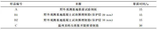 为明确实际海洋环境中钢筋锈蚀产物的力学特征参数,在海洋基础设施长期性能野外观测研究基地(简称野外观测基地)与温州某码头开展锈蚀产物取样分析工作。A、B类锈蚀产物样品分别取自野外观测基地暴露15a的钢板和预埋钢筋混凝土;C类锈蚀产物样品取自服役30a的温州码头工程锈裂横梁实体构件,对锈裂横梁进行破型取样。样品的基本信息以及部分实物图分别如表1、图1所示。